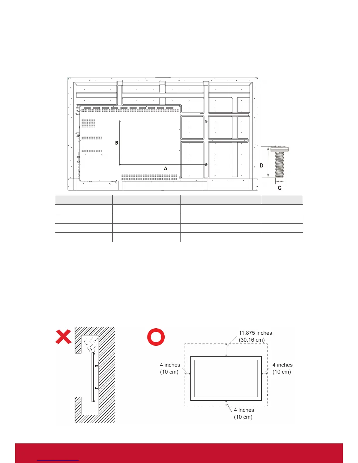 ViewSonic provides the standard dimensions for wall mount kits as shown in the