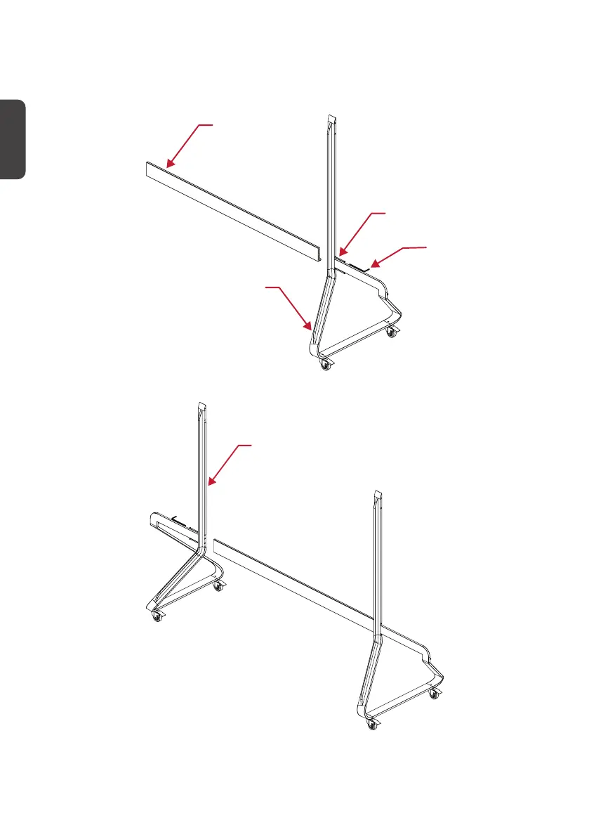  使用兩螺栓,將右支撐架「E」連接至下橫樑。