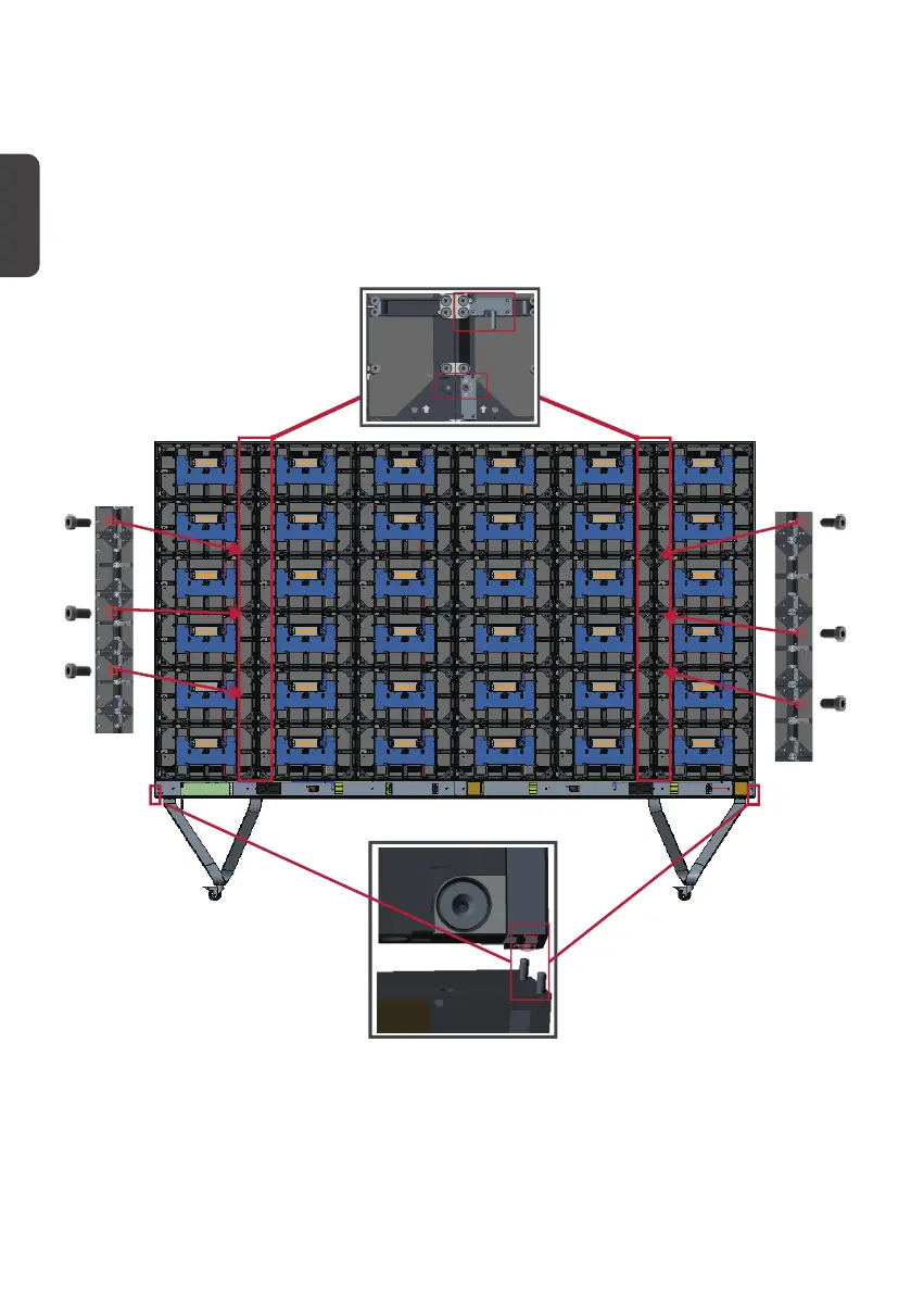  使用隨附的螺絲將左右機櫃固定至支撐架。