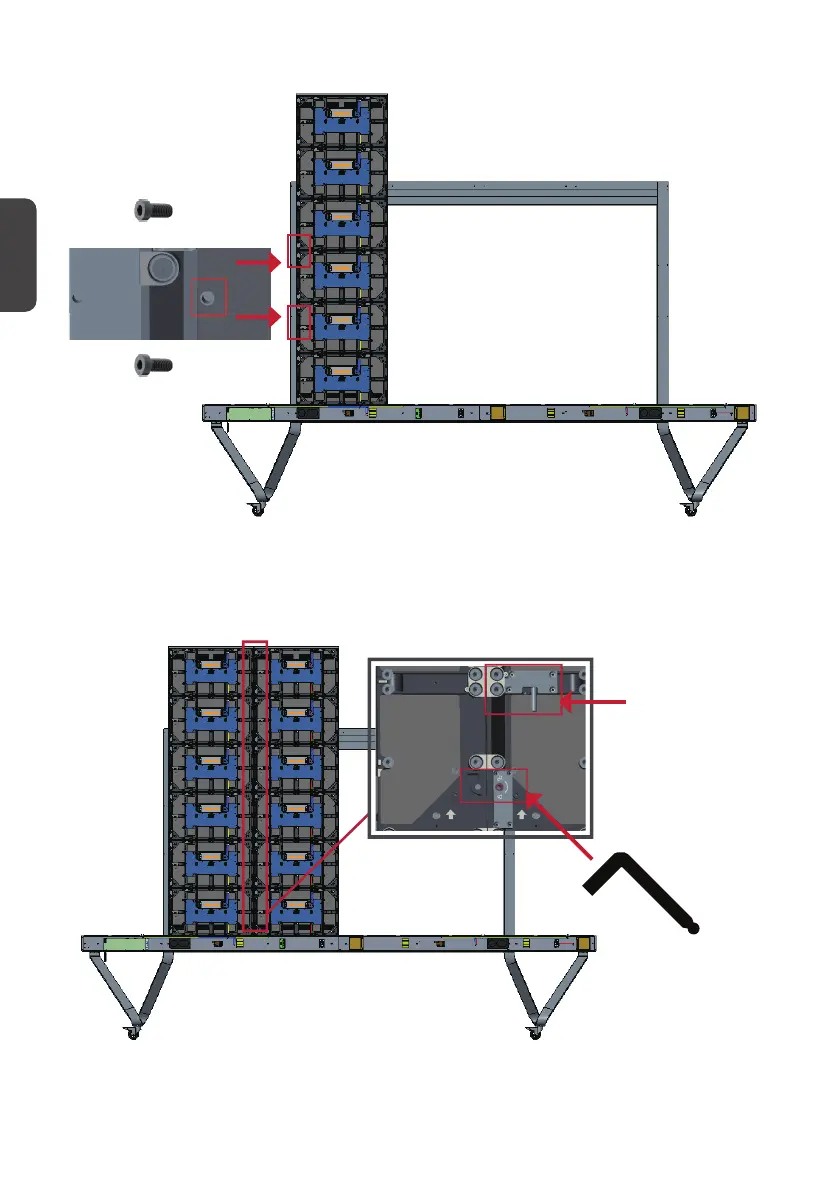  按压各个锁紧螺栓,然后使用六角工具锁定每个卡钩使各个机壳牢固地连接在