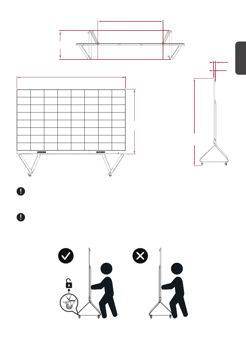 請勿推動顯示器的正面。移動前務必解鎖輪子。未遵守此注意事項可能導