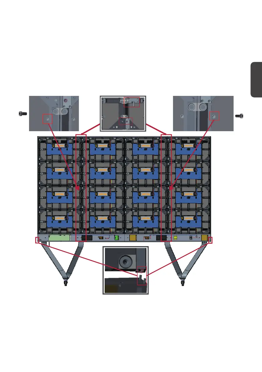  按压各个锁紧螺栓,然后使用六角工具锁定每个卡钩将左右支撑牢固地连接至