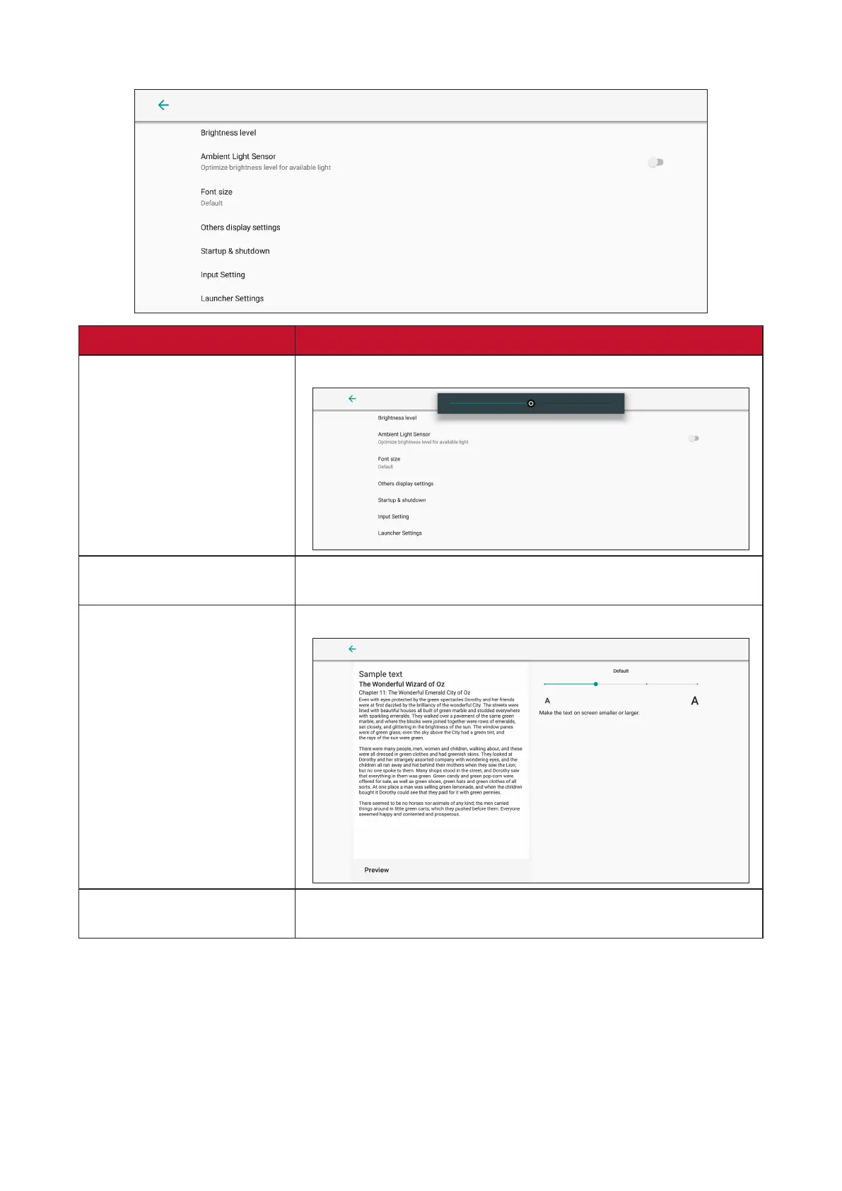 Preview and adjust the font size on the display.