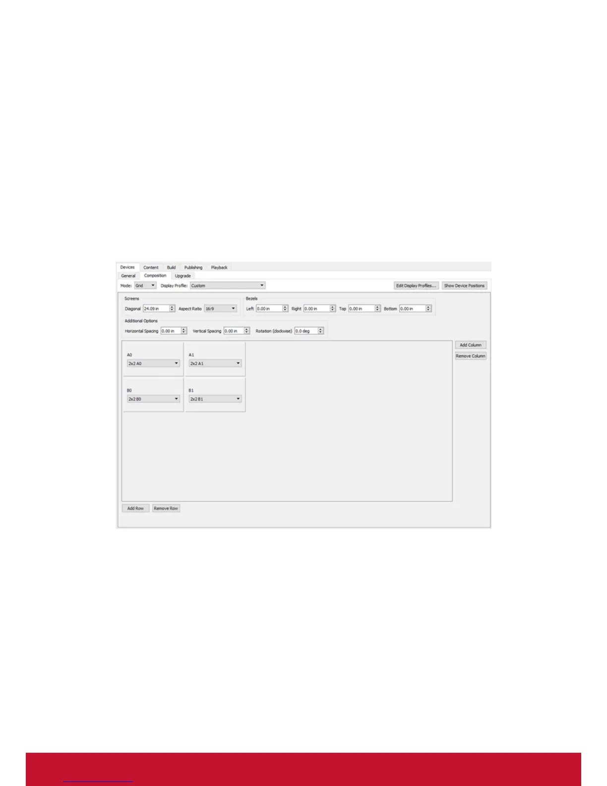 By default, the video wall has a composition of 2x2 (2 displays wide by 2 displays