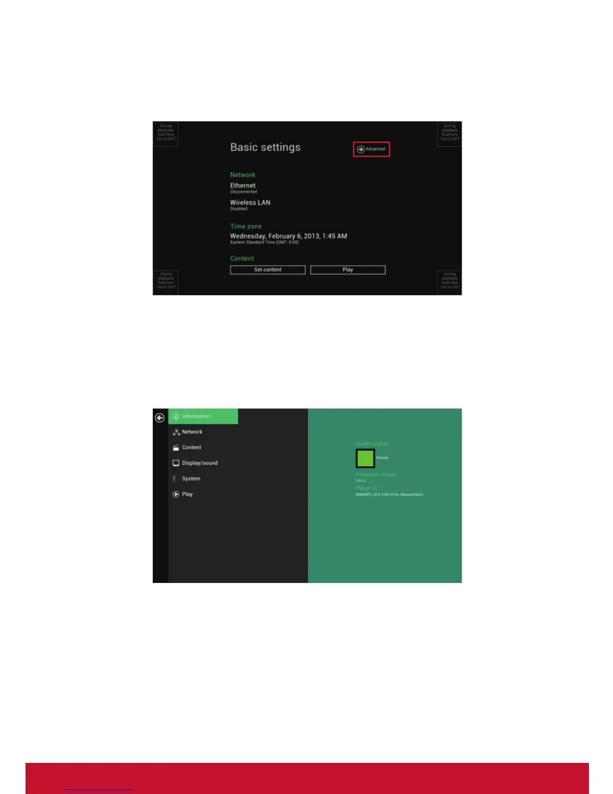 status, Firmware version and Player ID.