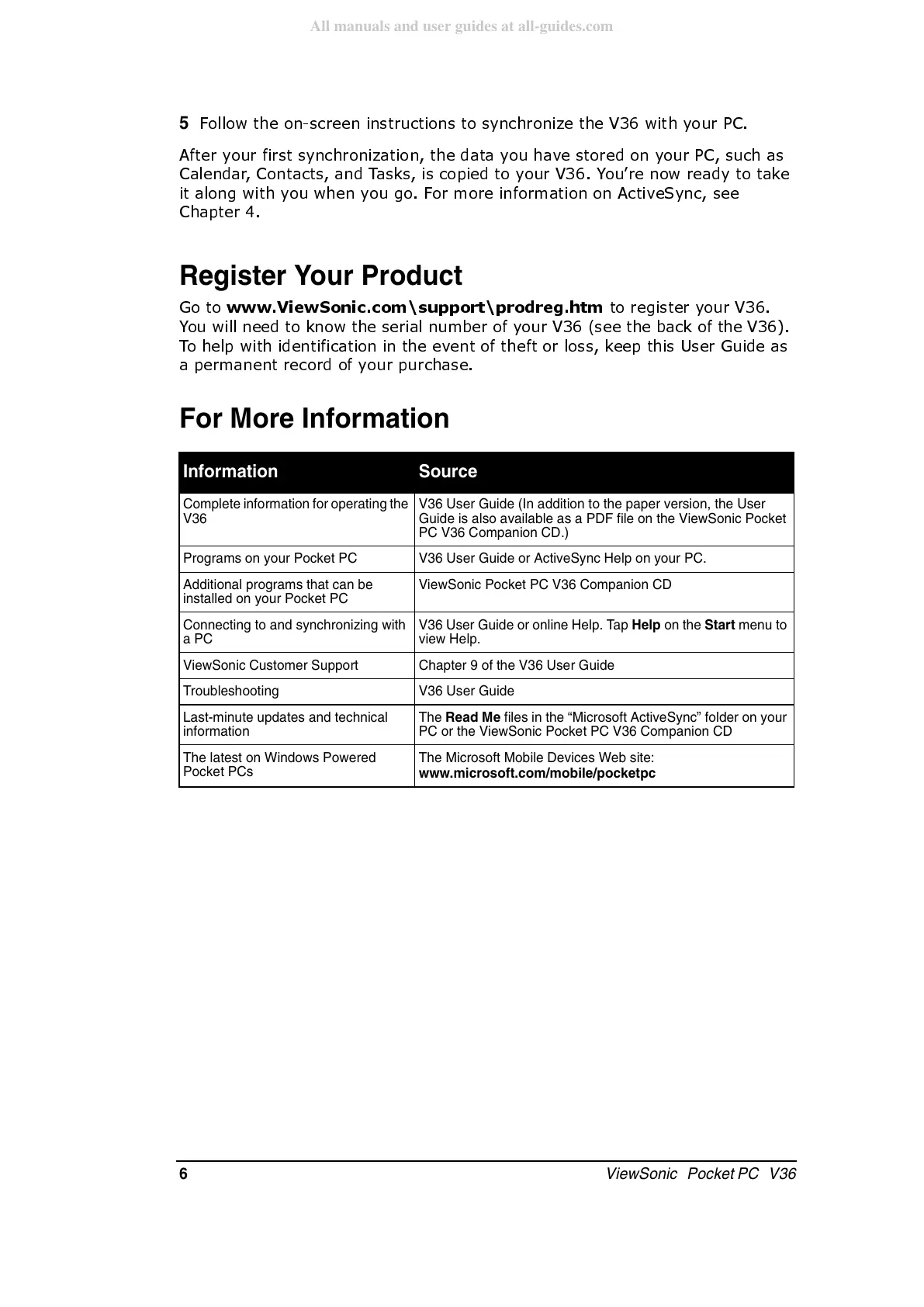 ViewSonic Customer Support Chapter 9 of the V36 User Guide