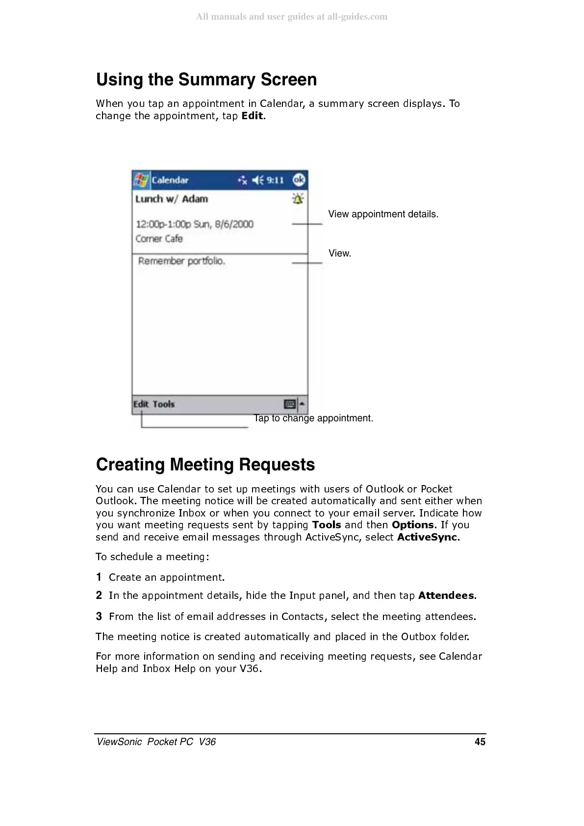 ViewSonic Pocket PC V36 - Using the Summary Screen; Creating Meeting Requests