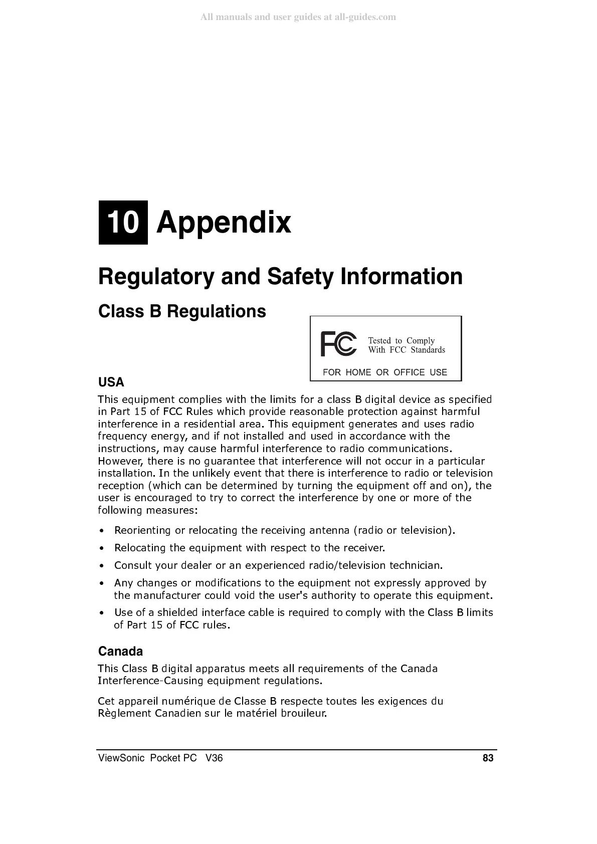 ViewSonic Pocket PC V36 - Appendix; Regulatory and Safety Information; Class B Regulations