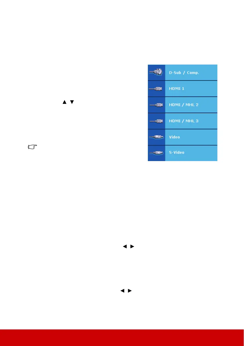 • Auto: Sets the projector to detect the color space setting of the input signal