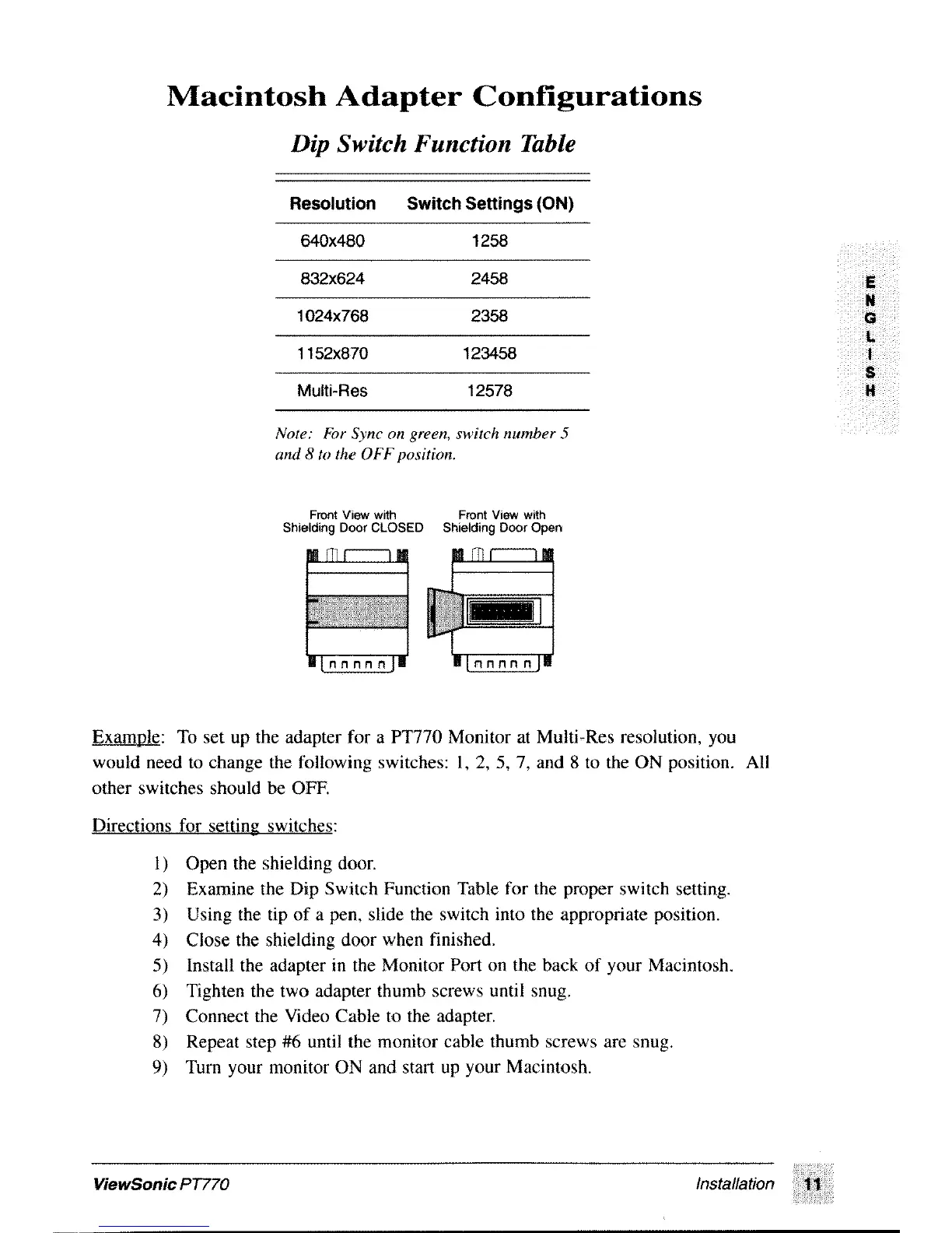 ViewSonic PT770 - Macintosh Adapter Configurations; Dip Switch Function Table; Directions for Setting Switches
