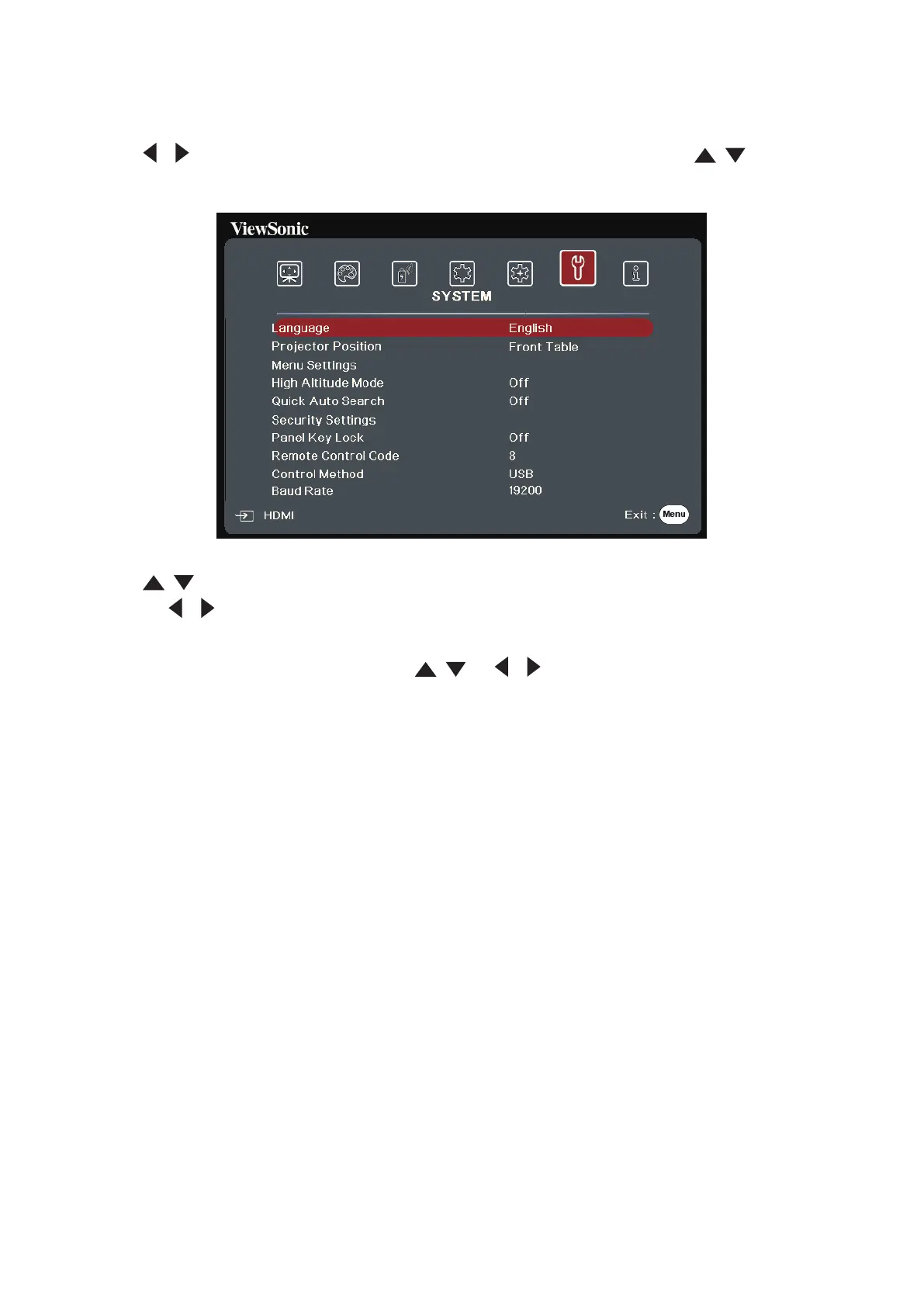 2. Press / to select the SYSTEM menu. Then press Enter or use / to access