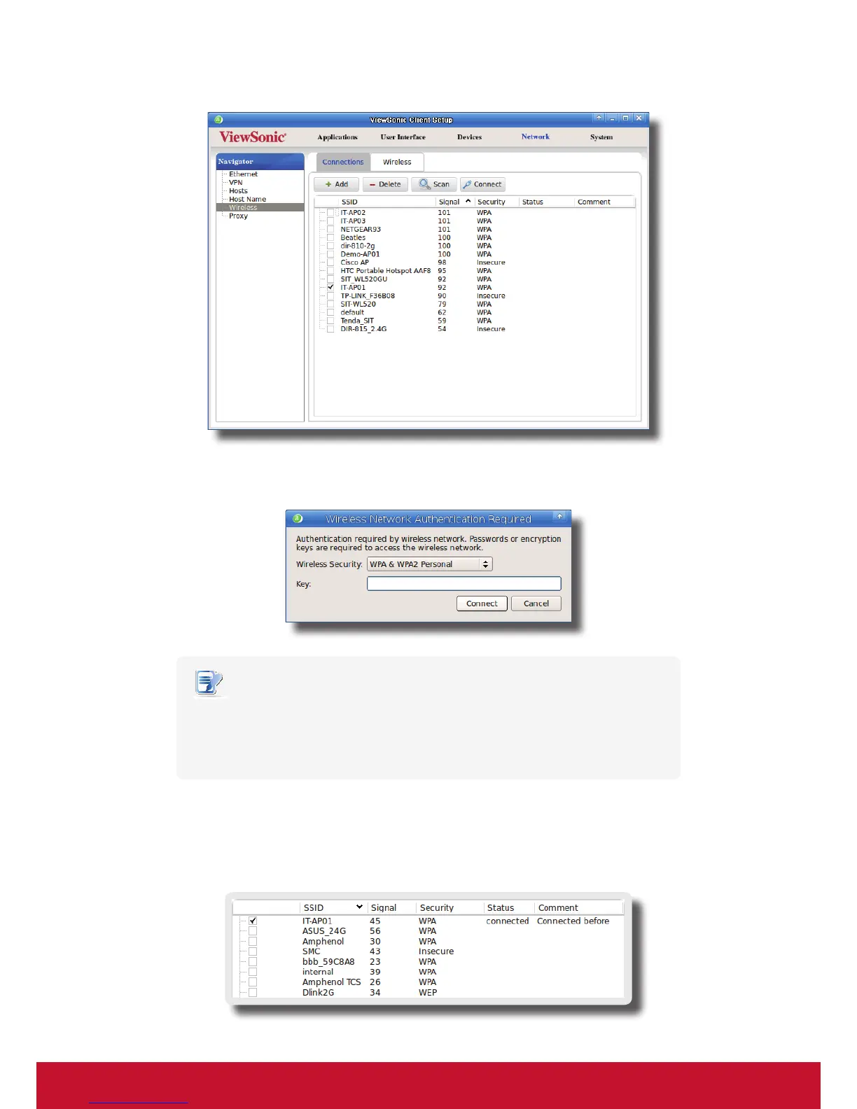 6. Upon completion, the Status column of the wireless network will show connected.