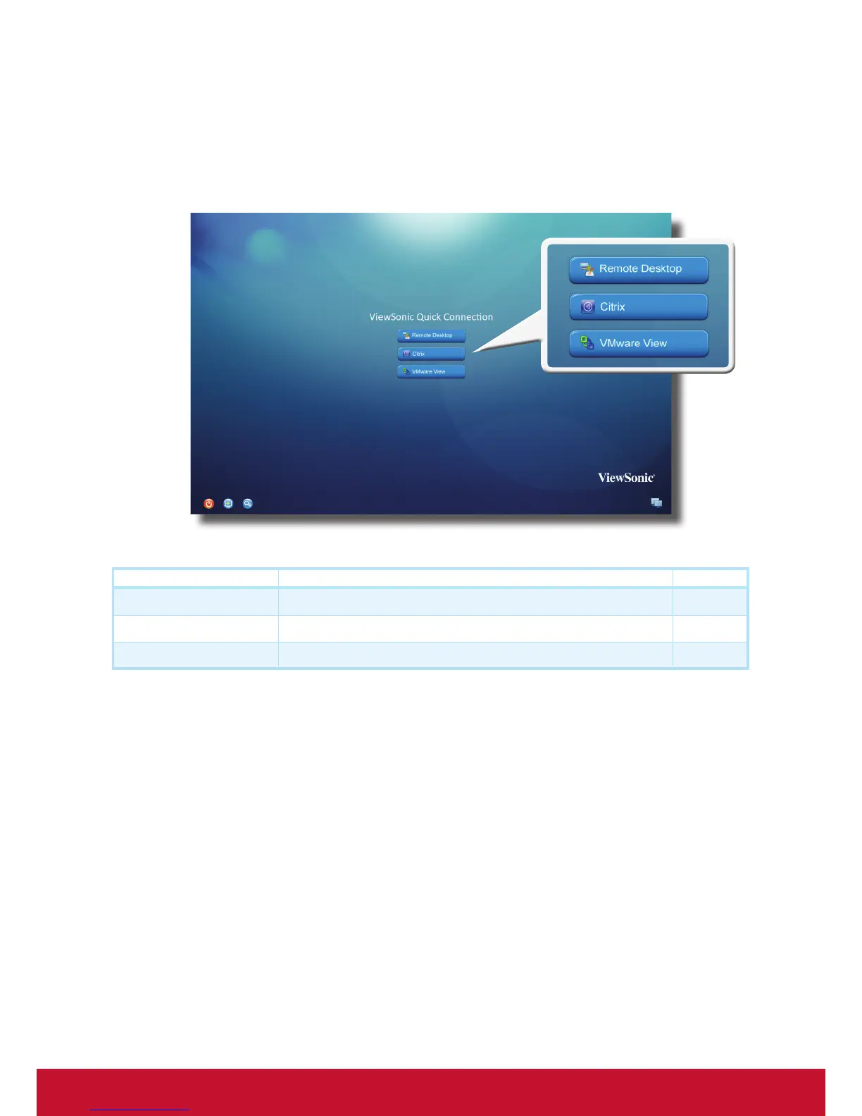Through ViewSonic Quick Connection screen, you can access three types of desktop virtualization services:
