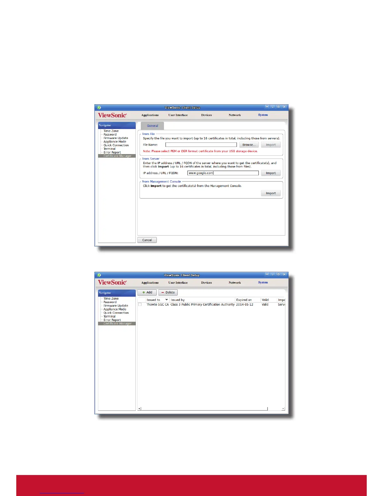 1. On ViewSonic Client Setup, click System > Certicate Manager.
