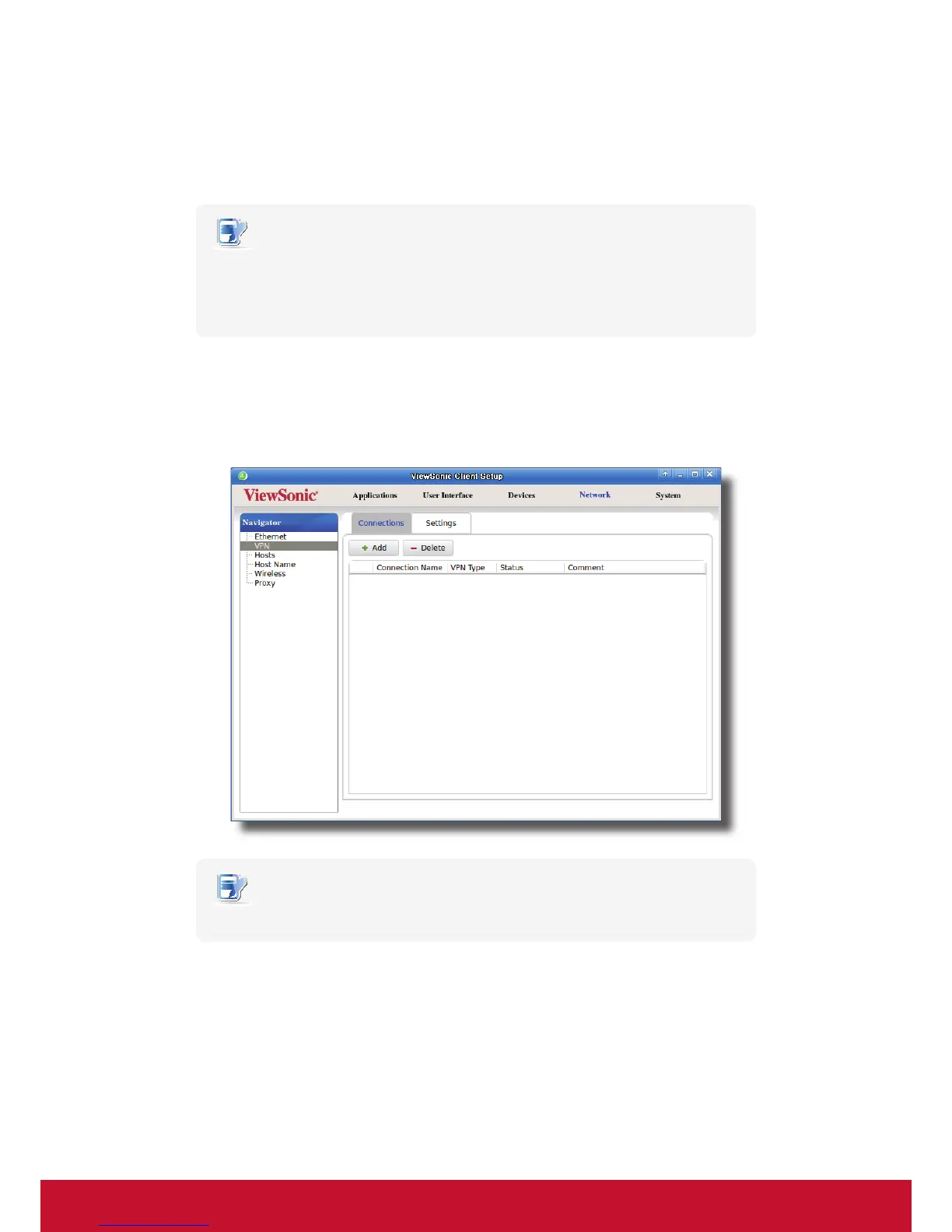 1. On ViewSonic Client Setup, click Network > VPN to open the Virtual Private Network list.