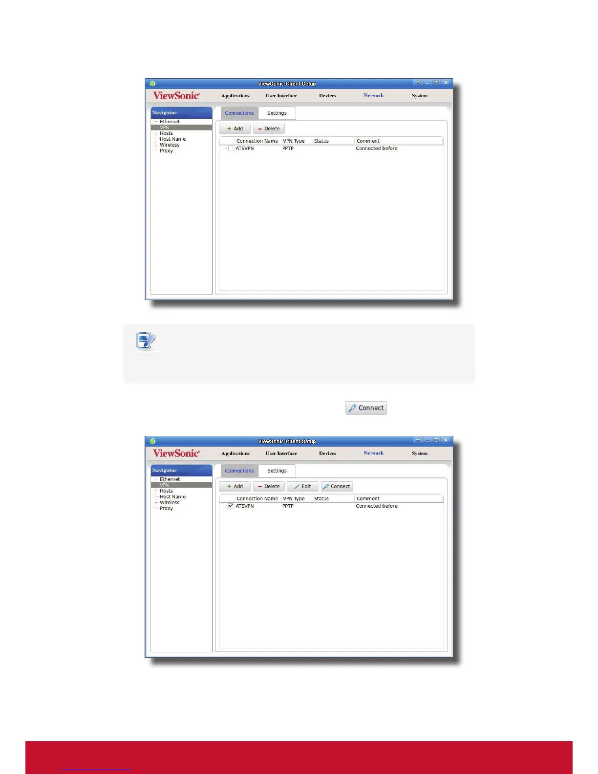 3. Click Connect to create a virtual private network connection through the selected network entry.