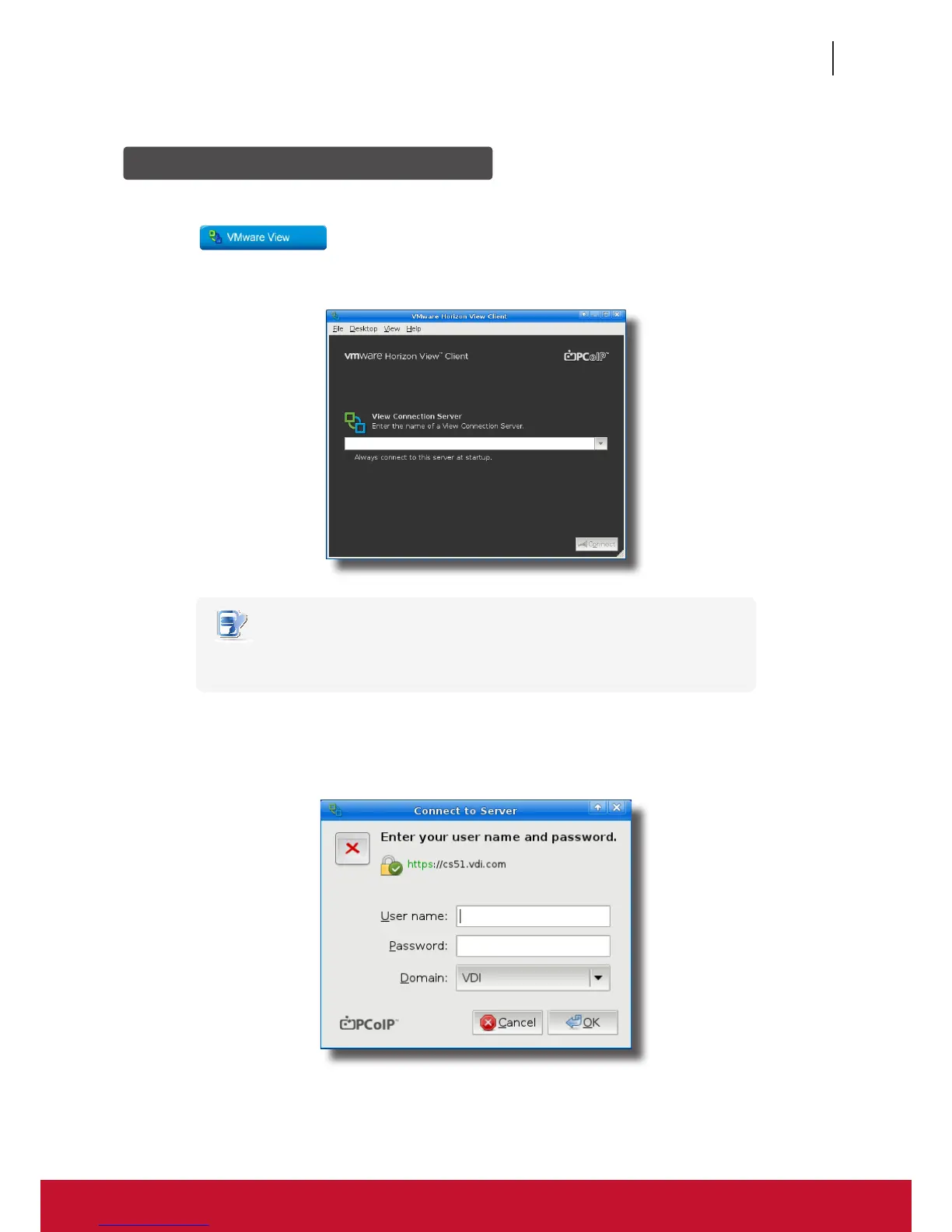2. On the opened window, enter the IP address or computer name of the VMware View Connection Server, and