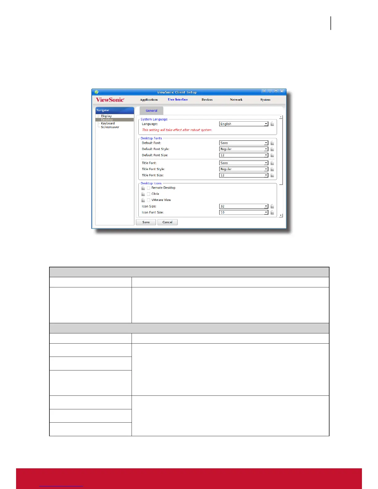 1. On ViewSonic Client Setup, click User Interface > Desktop.