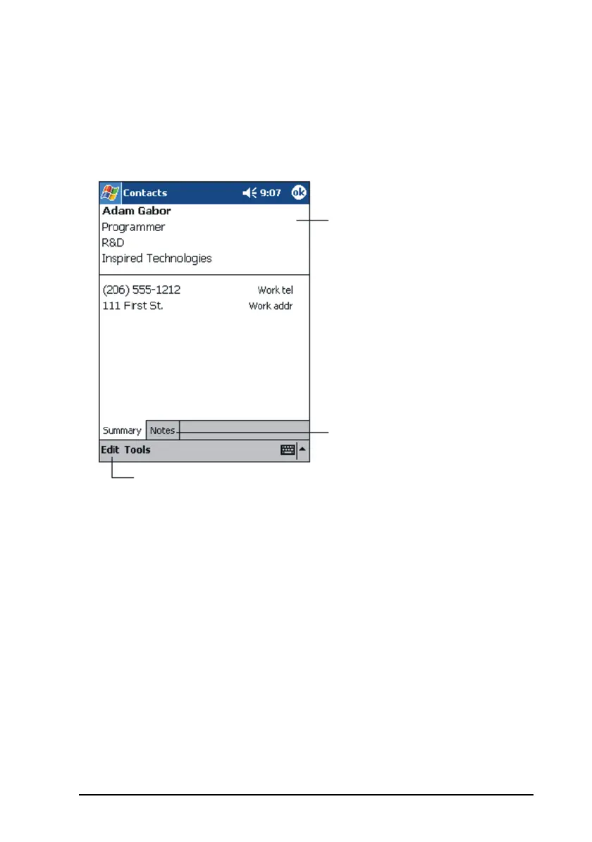 When you tap a contact in the contact list, a summary screen displays. To