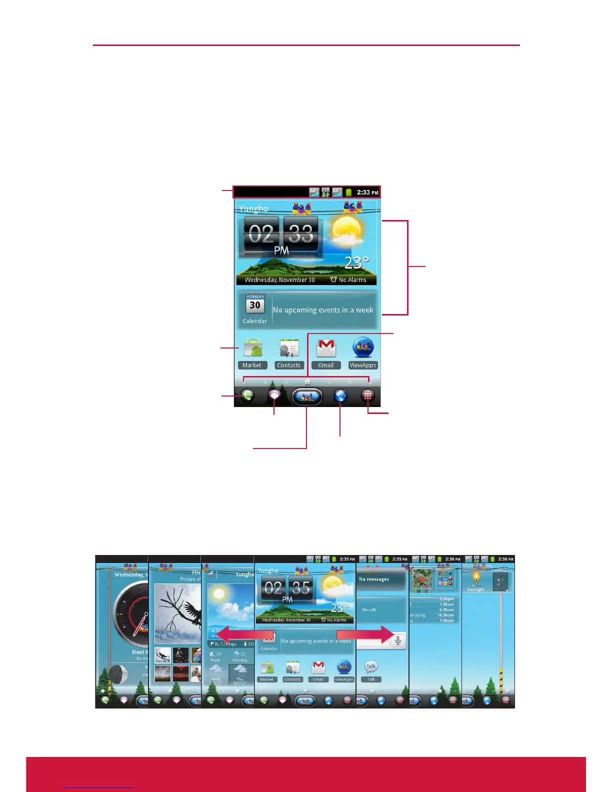 The two extensions to the left and to the right of the Home screen provide more space
