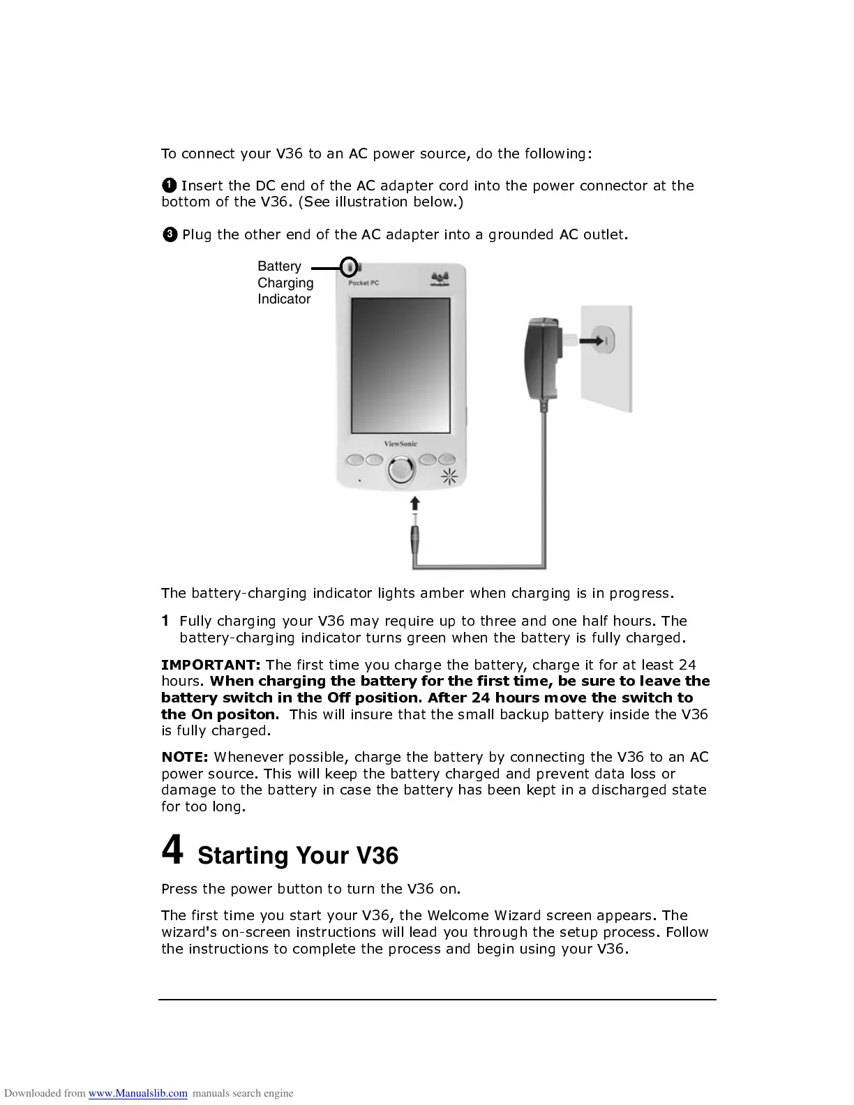 ViewSonic V36 - Charging the Battery; Starting Your V36