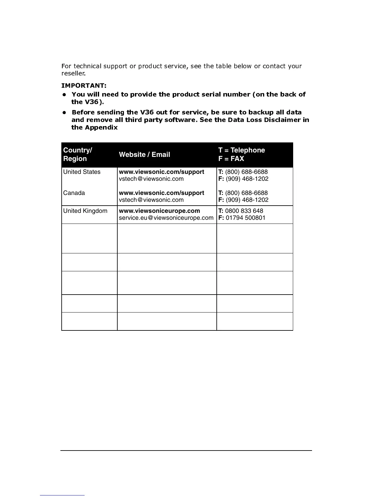 ViewSonic V36 - Data Loss Disclaimer