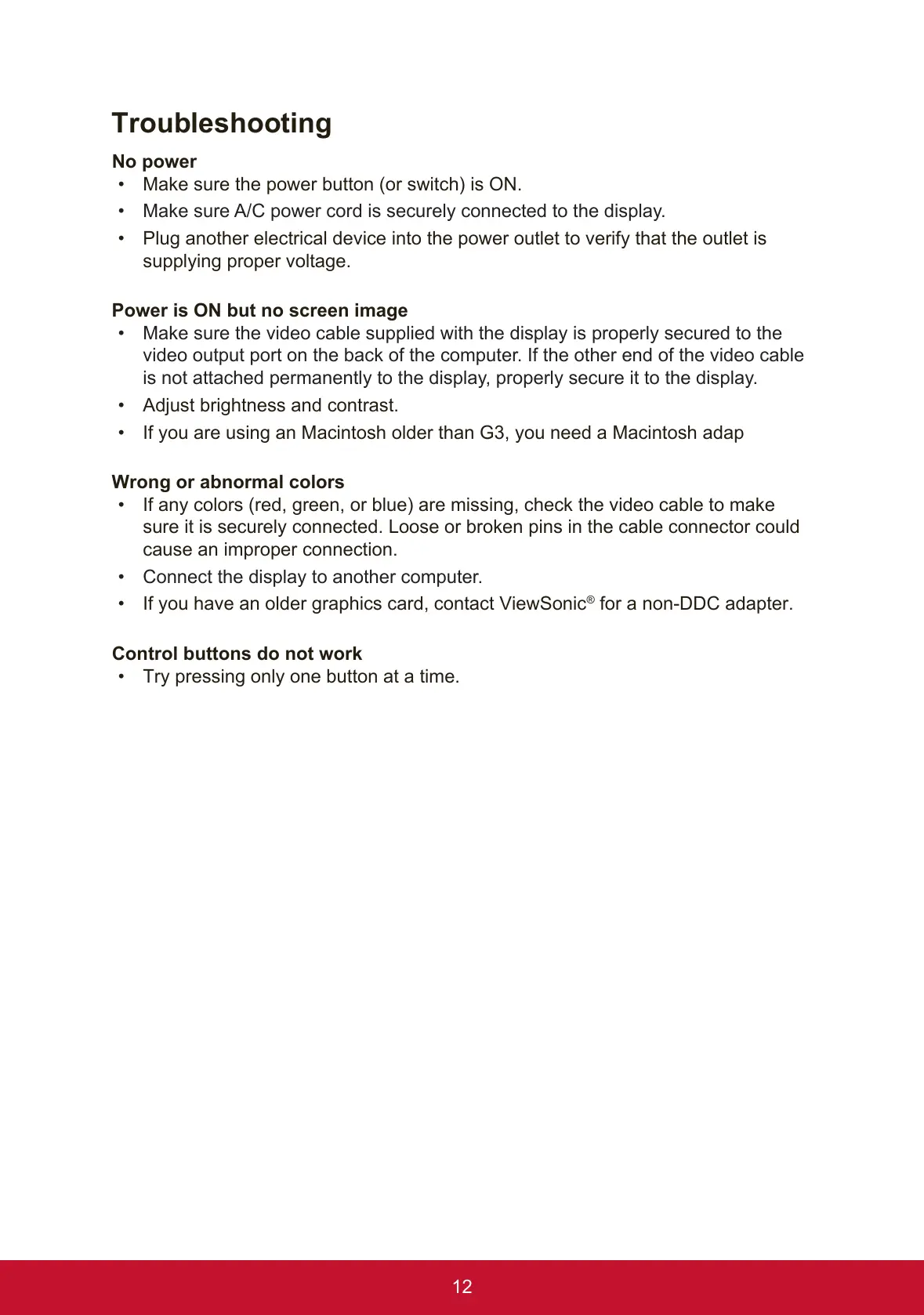 If any colors (red, green, or blue) are missing, check the video cable to make