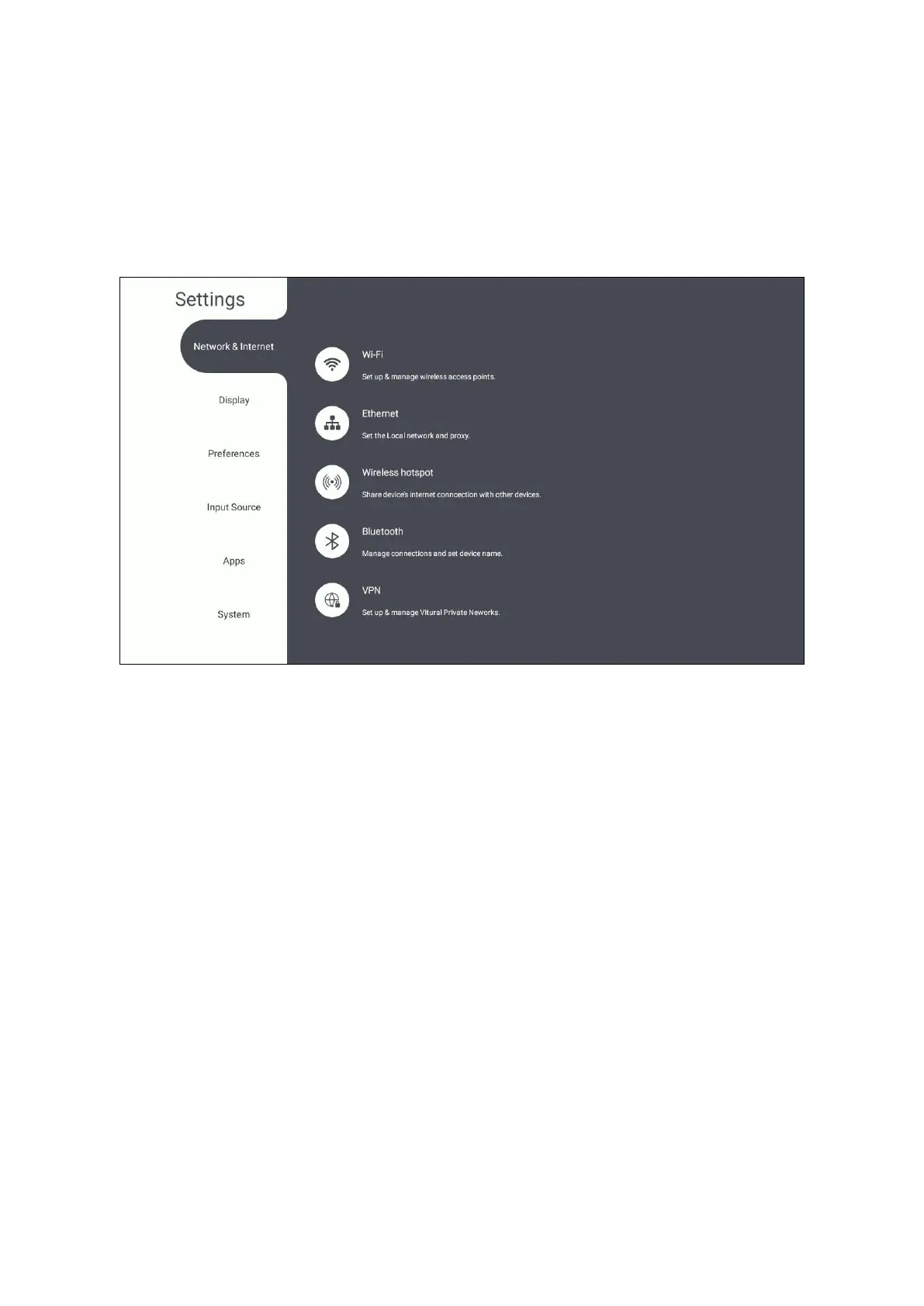 Check current network connecon status, set up and manage Wi-Fi, Ethernet,