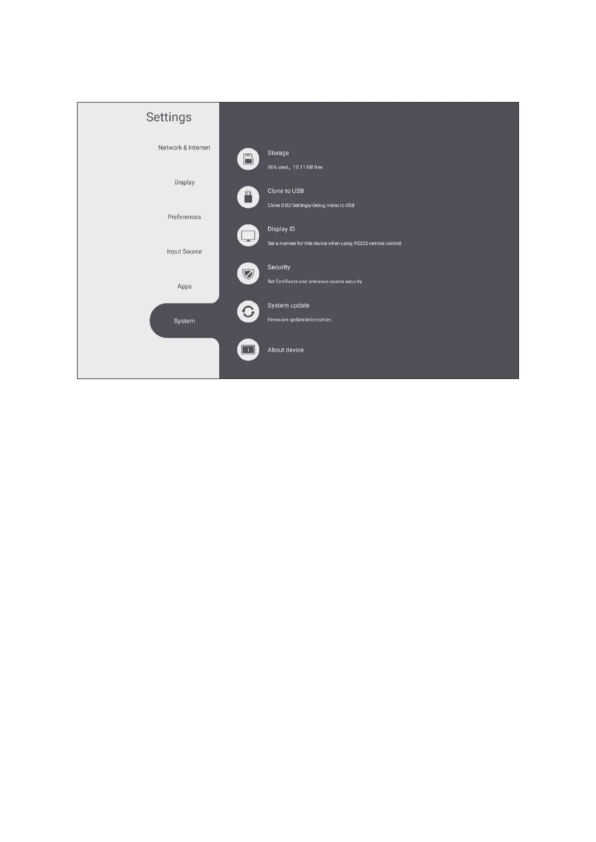 View and adjust Storage, Clone to USB, Display ID, Security, System Update, and