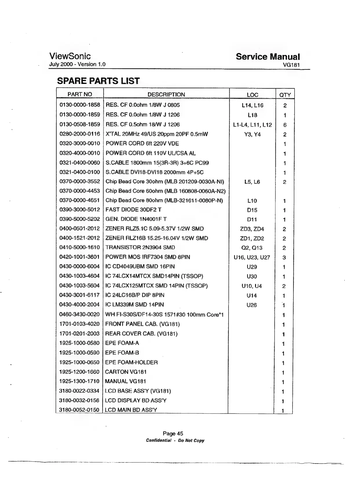 ViewSonic VG181 - Spare Parts List