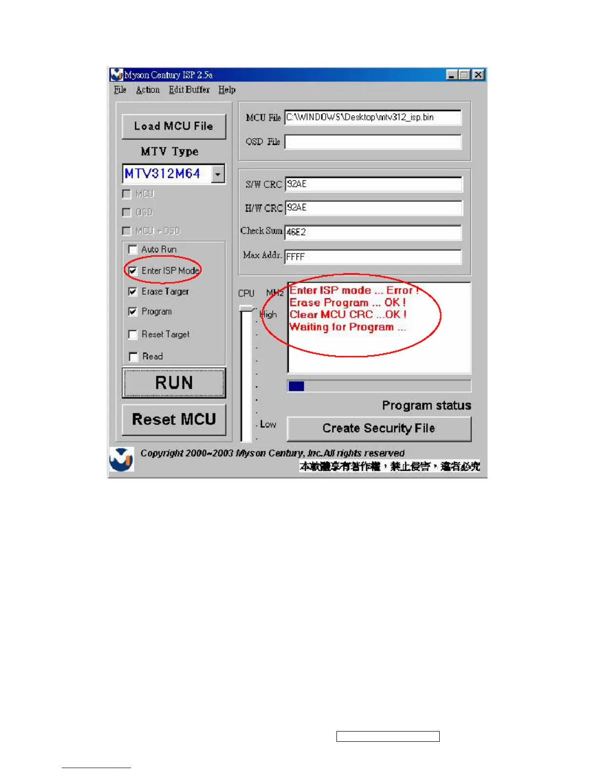 When you could not select or click Reset MCU button and enter ISP mode again, you refer the message as below: