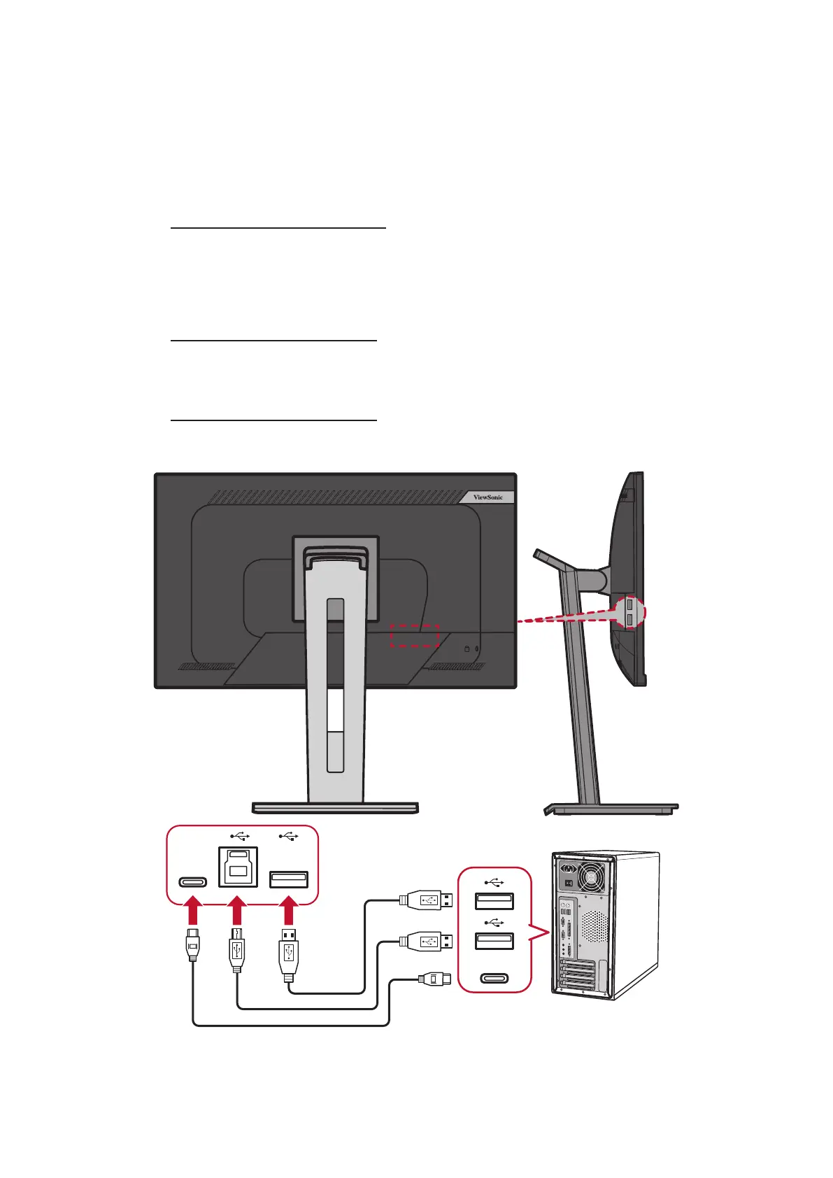 Connect one end of a USB cable to a USB port of the monitor. Then connect the