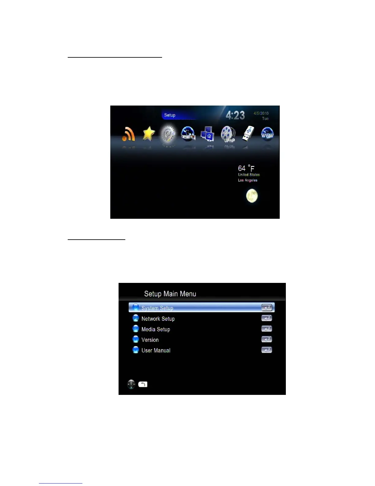 and select “System Setup” from Setup Main Menu. You can select, configure or adjust Language, TV