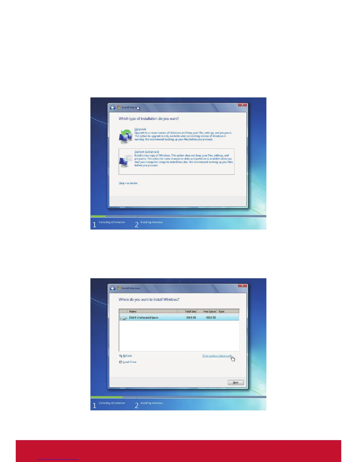 “Drive options (advanced)” to delete them. When all partitions are clean, setup will display the