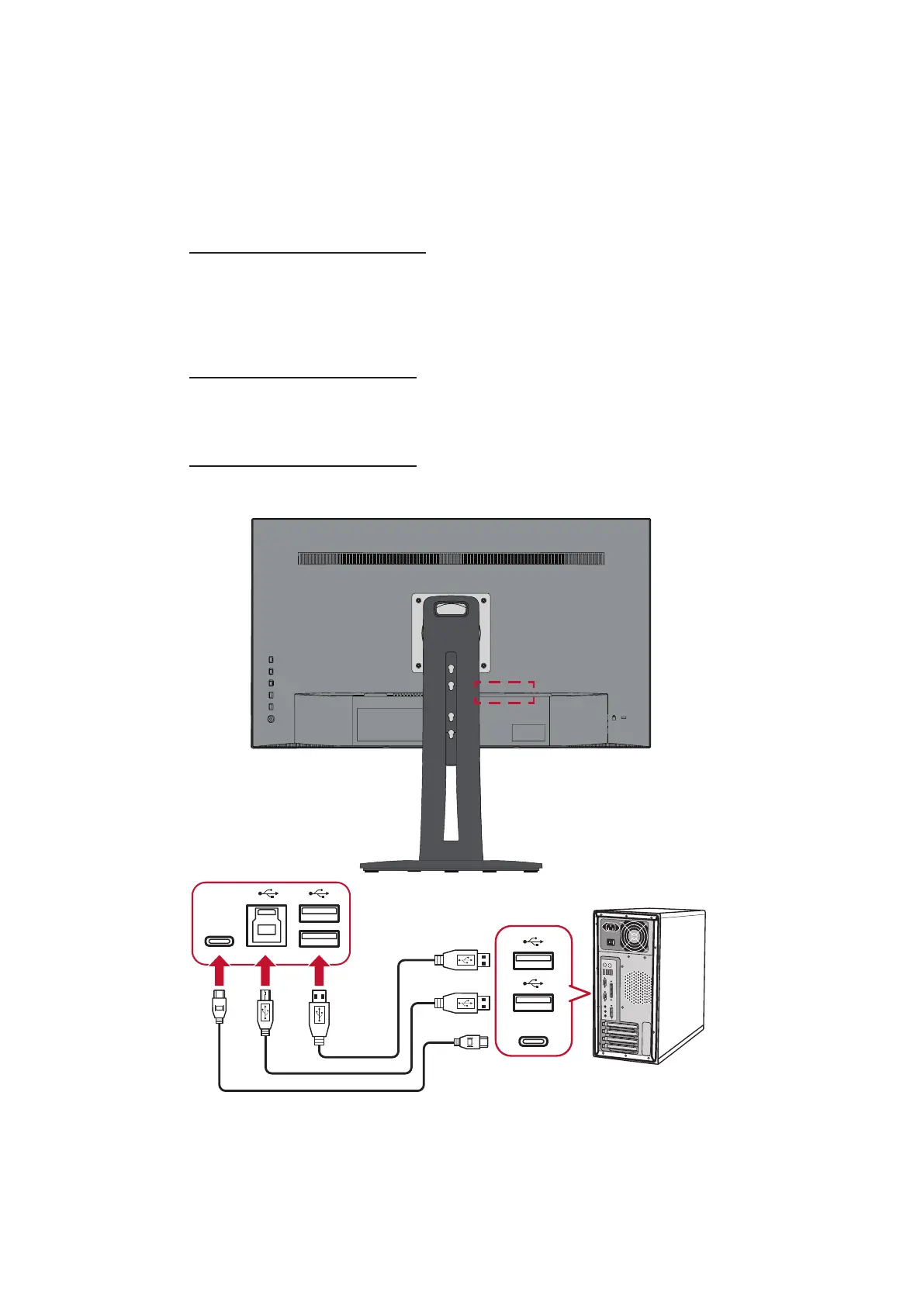 Connect one end of a USB cable to a USB port of the monitor. Then connect the