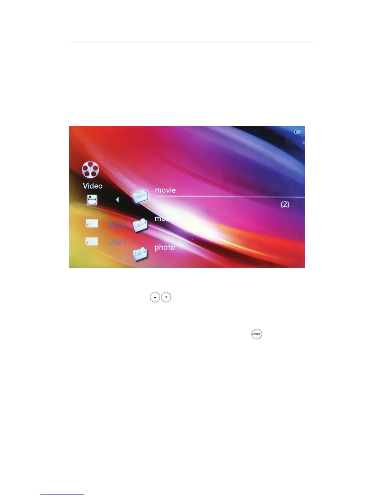 On the main menu, select the "Video" icon. Use the Up/Down button to