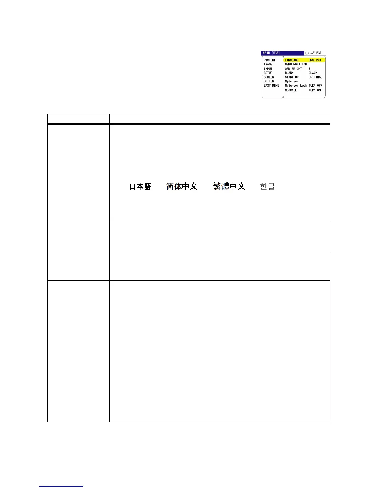 Menú SCREEN (PANTALLA)