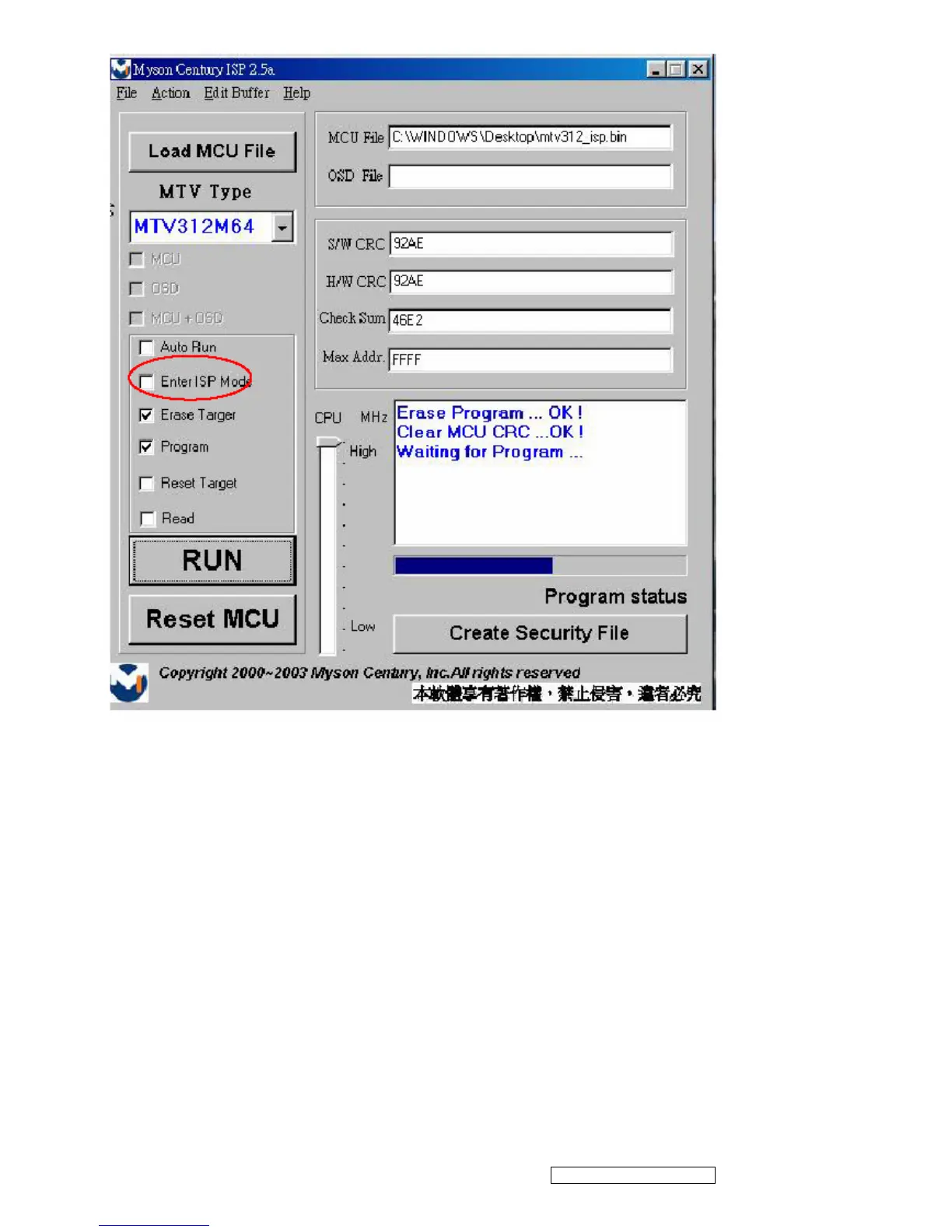 (2)If you using the MTV312M64 or before MCU serials, the MCU will always in ISP Modeeven programming fail or
