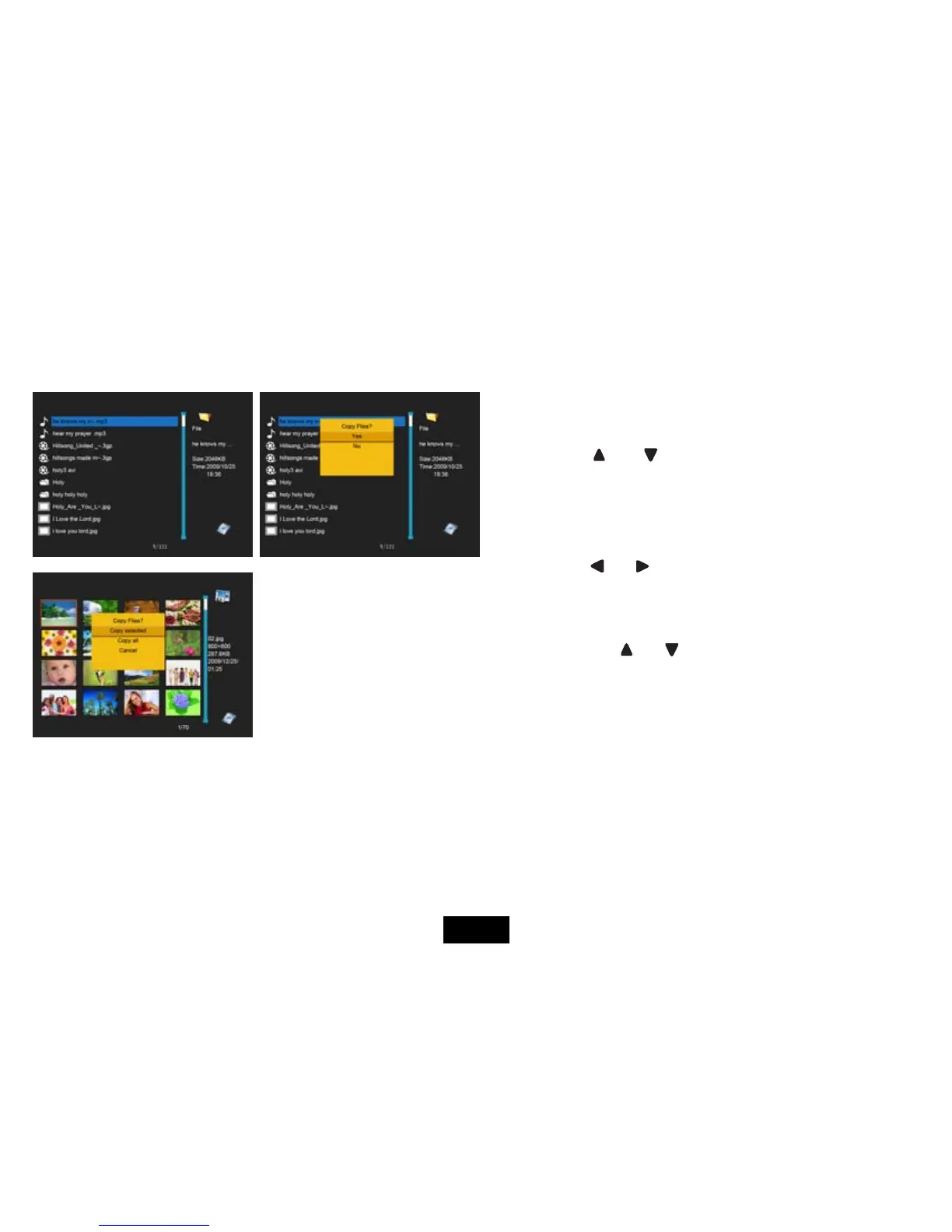 In the File mode, you can view all playable files and folders on the memory source. You also can copy or delete the files.