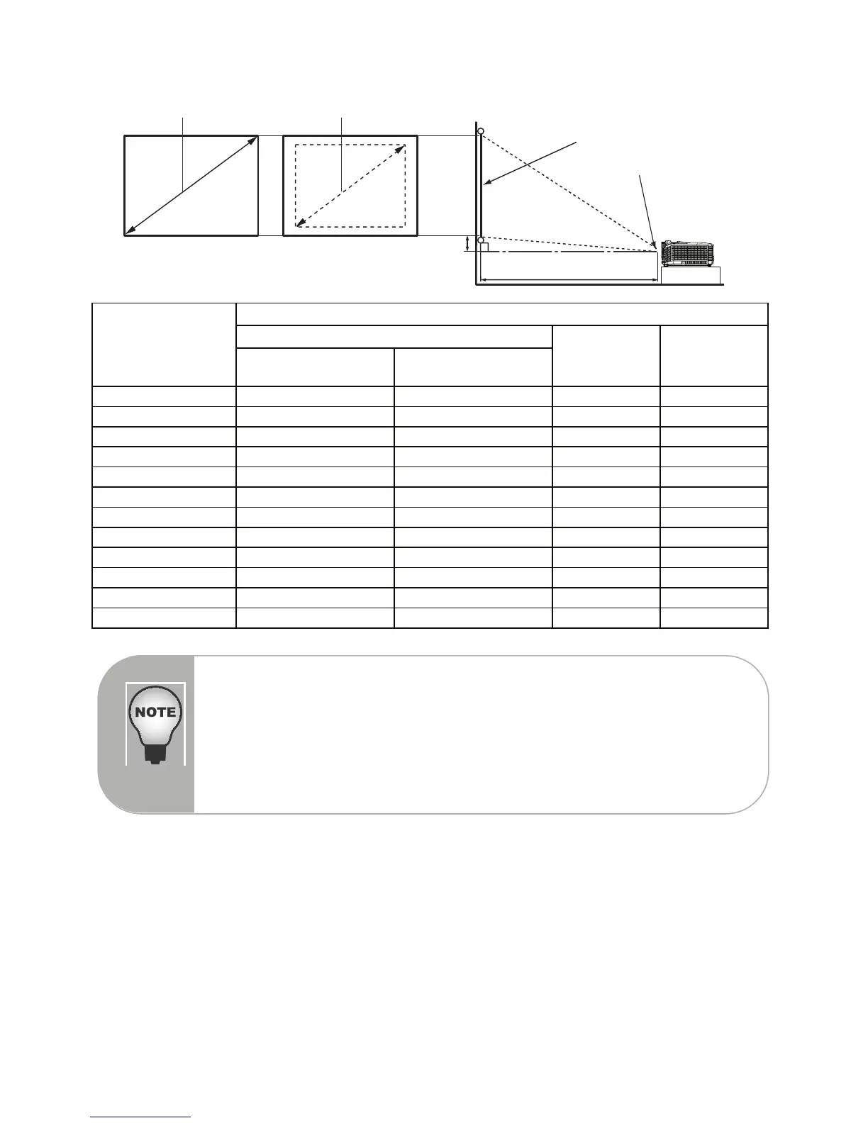 Refer to the graphic and table below to determine the screen size and projection distance.