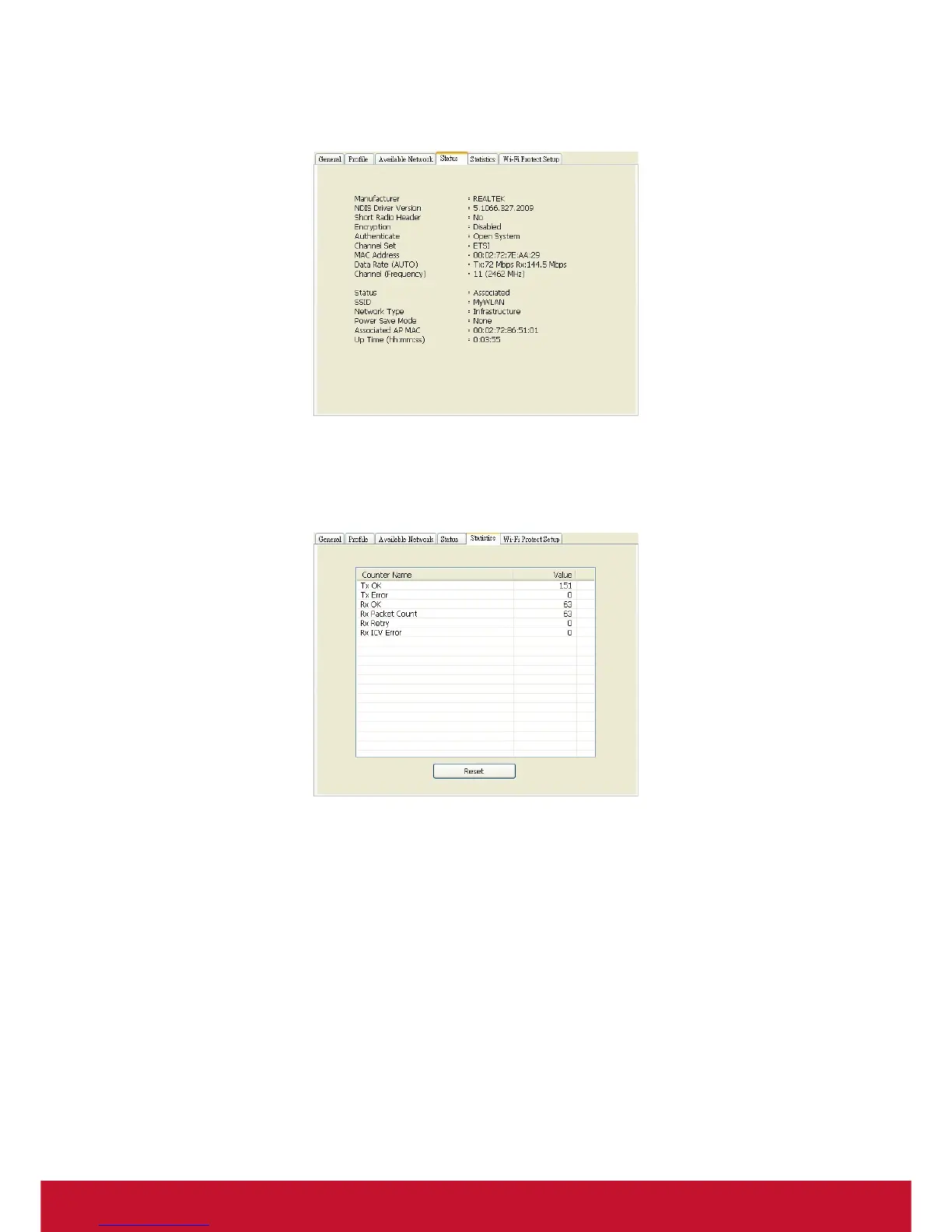 the wireless performance. Click Reset button to set counter to zero.