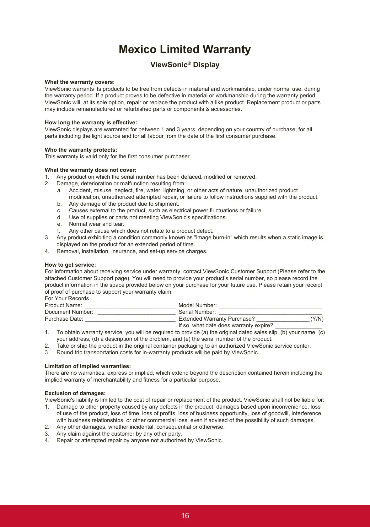 For information about receiving service under warranty, contact ViewSonic Customer Support (Please refer to the