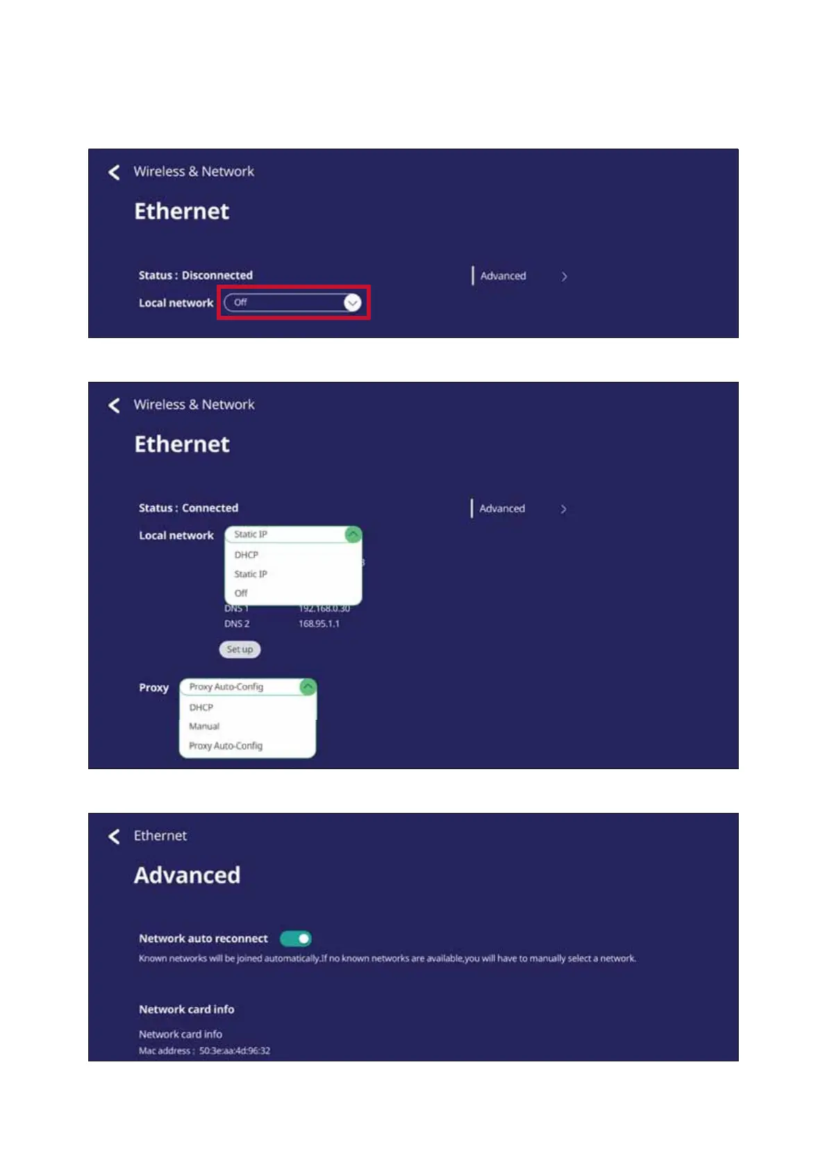 • Tap the drop down menu to connect/disconnect the Ethernet.