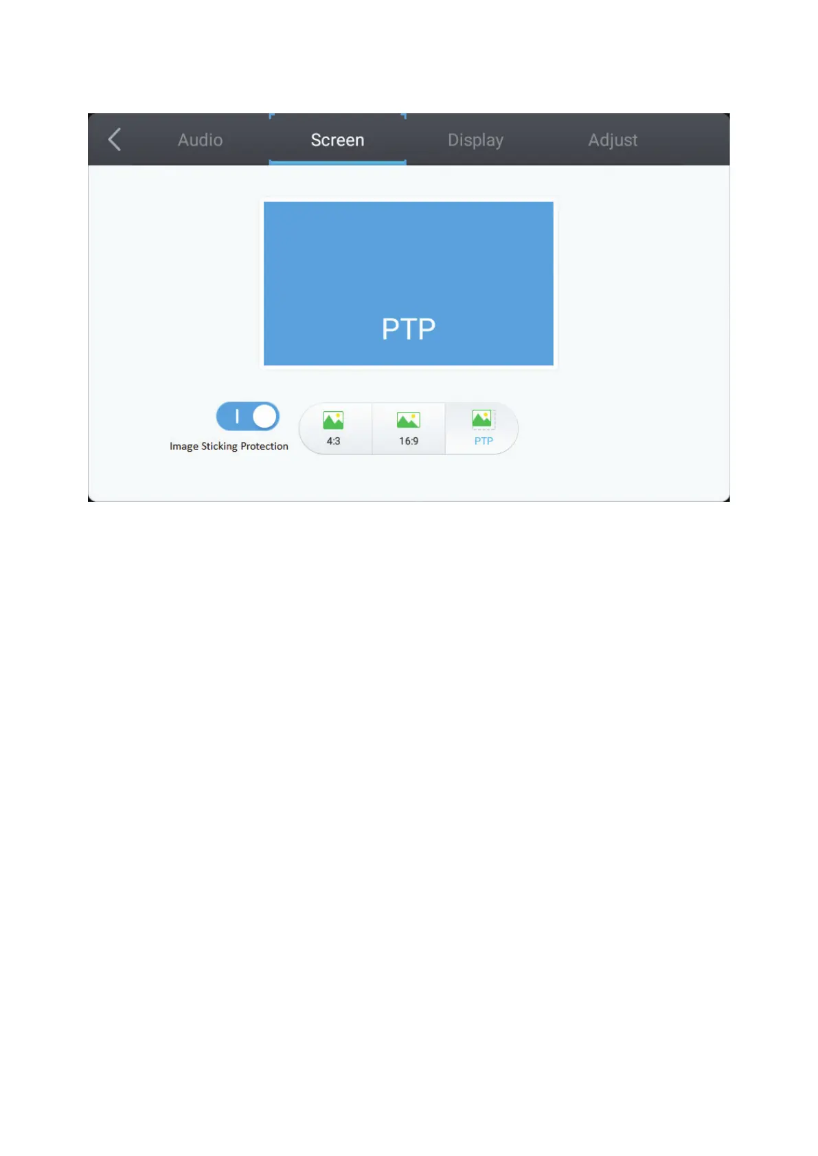 3. To change the screen rao, directly select 4:3, 16:9, or PTP.