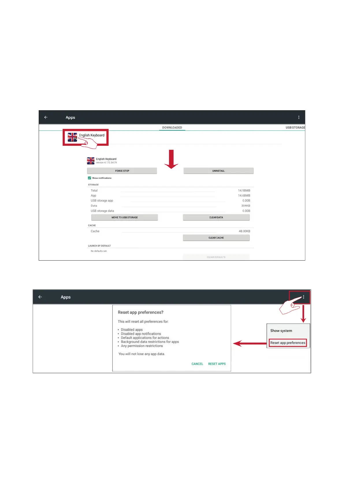 The user can view app informaon and force stop, uninstall, move to USB storage,