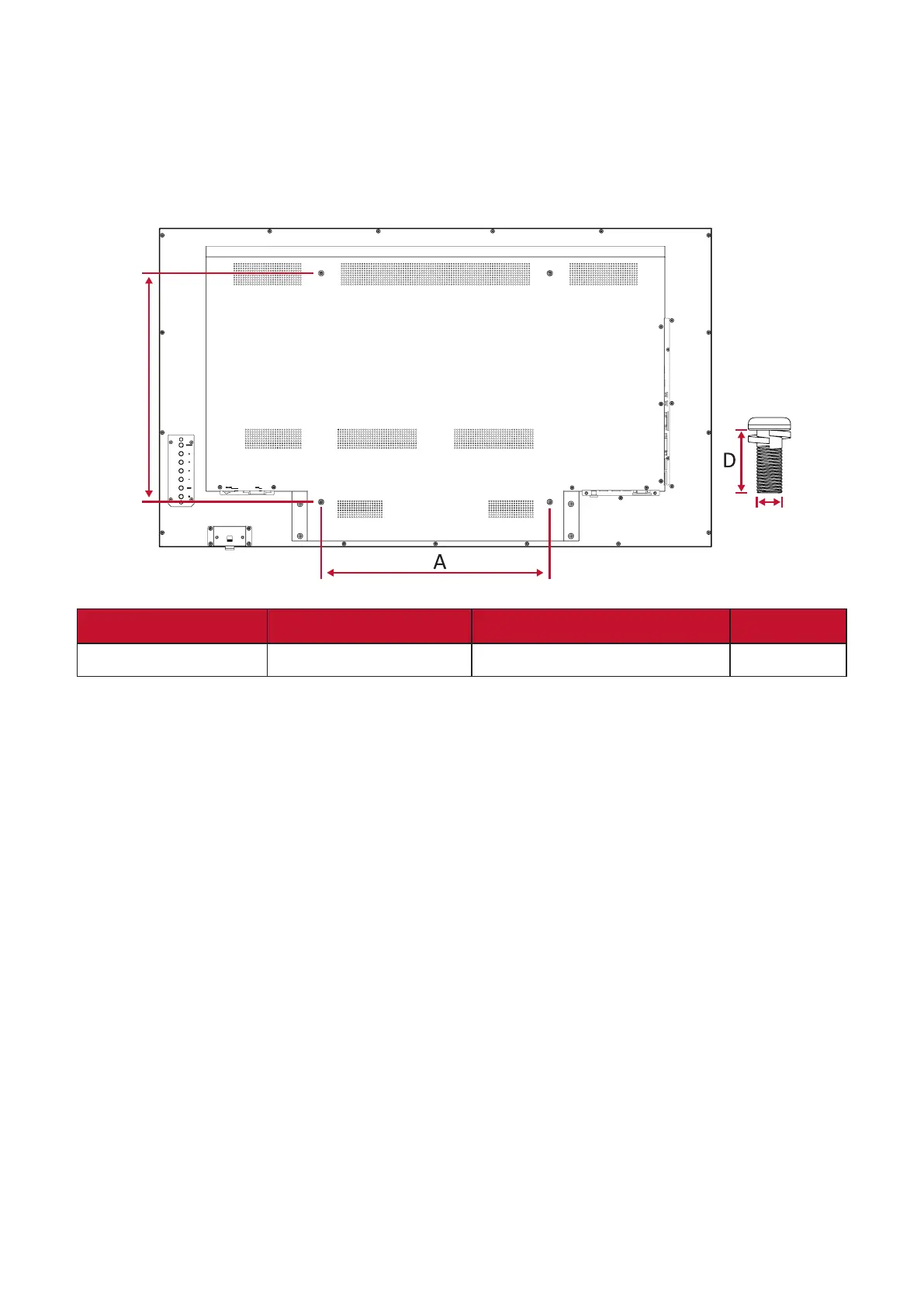 Model VESA Spec. (A x B) Standard Screw (C x D) Quanty