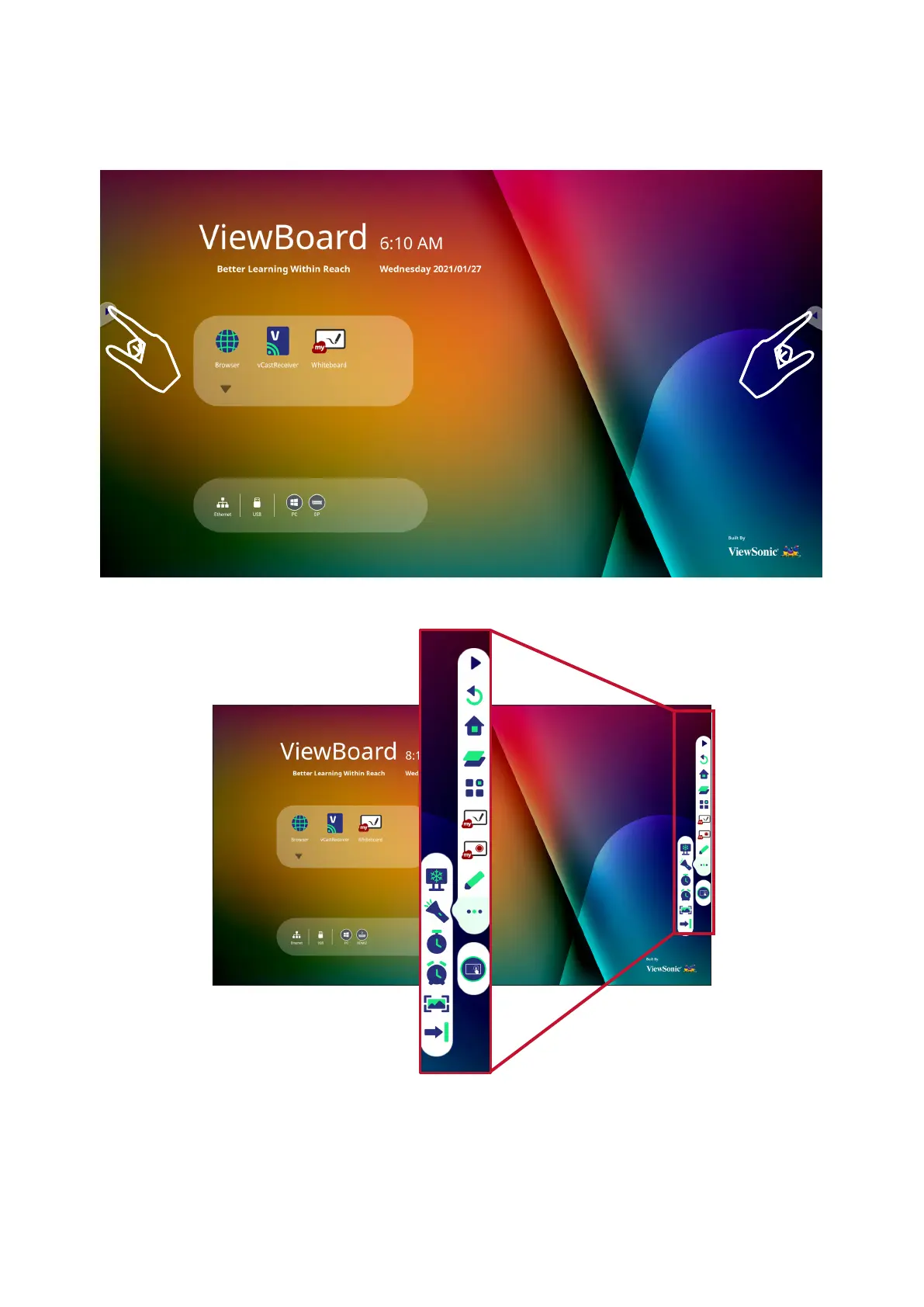 Toolbar trigger icons are on the edge of the ViewBoard launcher providing access to