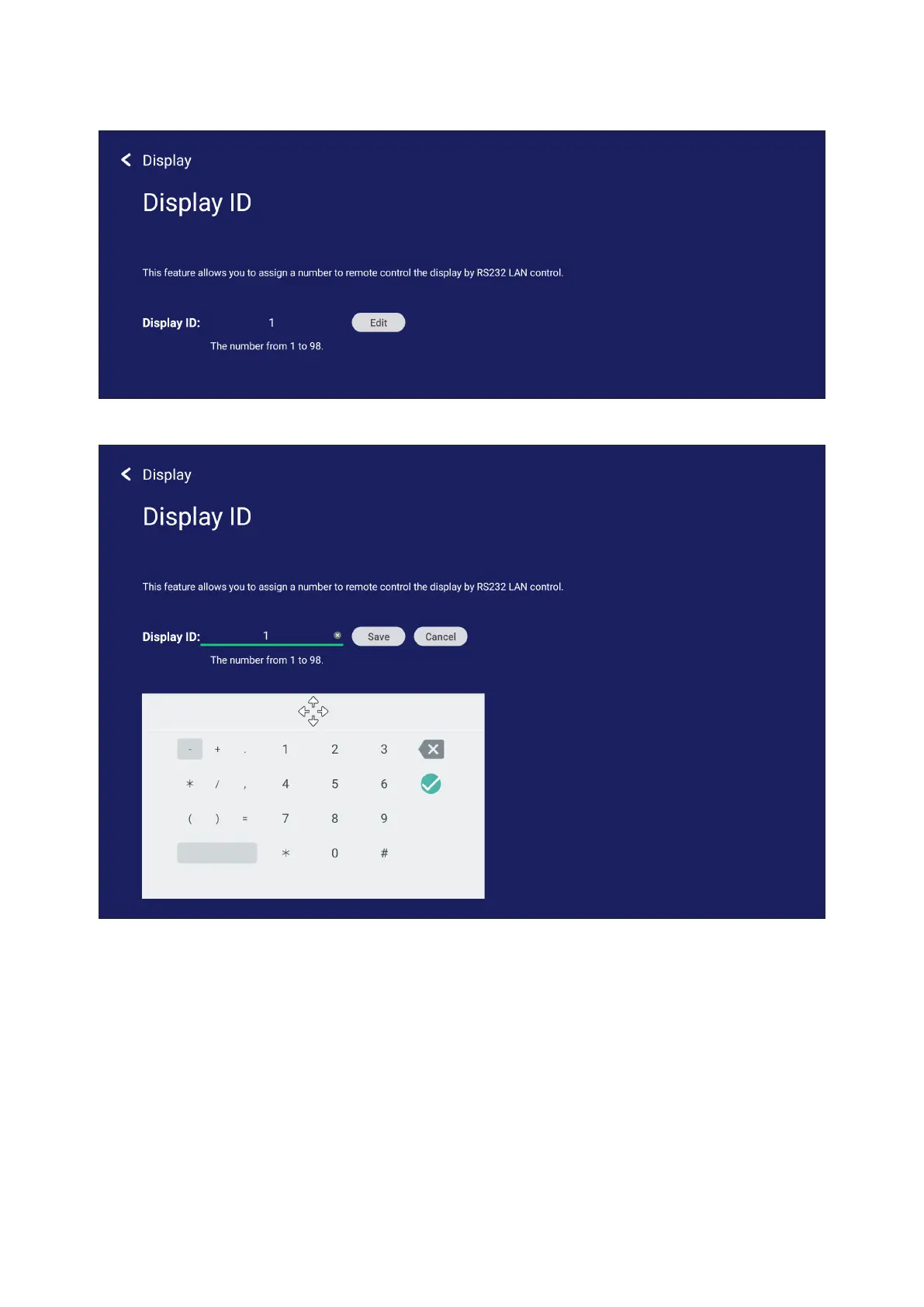 NOTE:  The Display ID is for RS-232 users, and the range is 01~99.