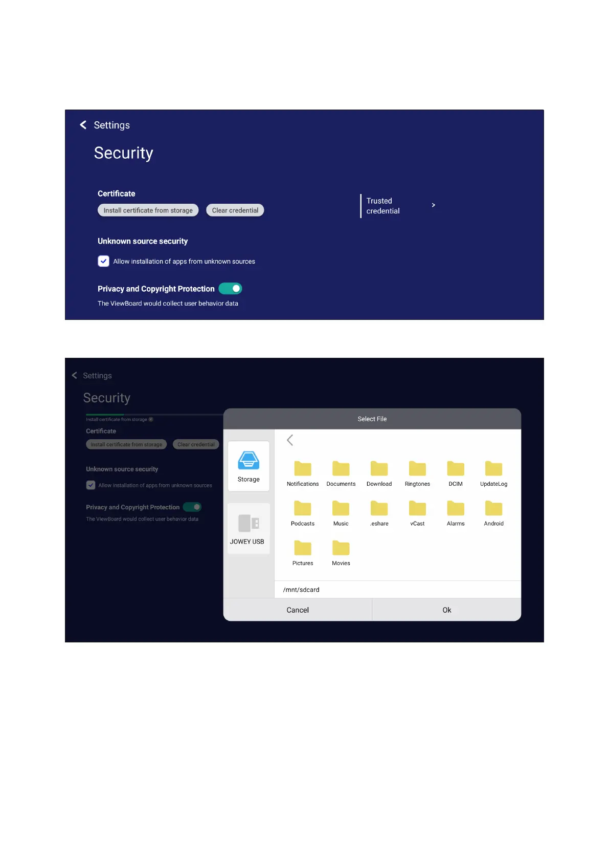 Review Cercate, Trusted Credenal storage, and Unknown sources install