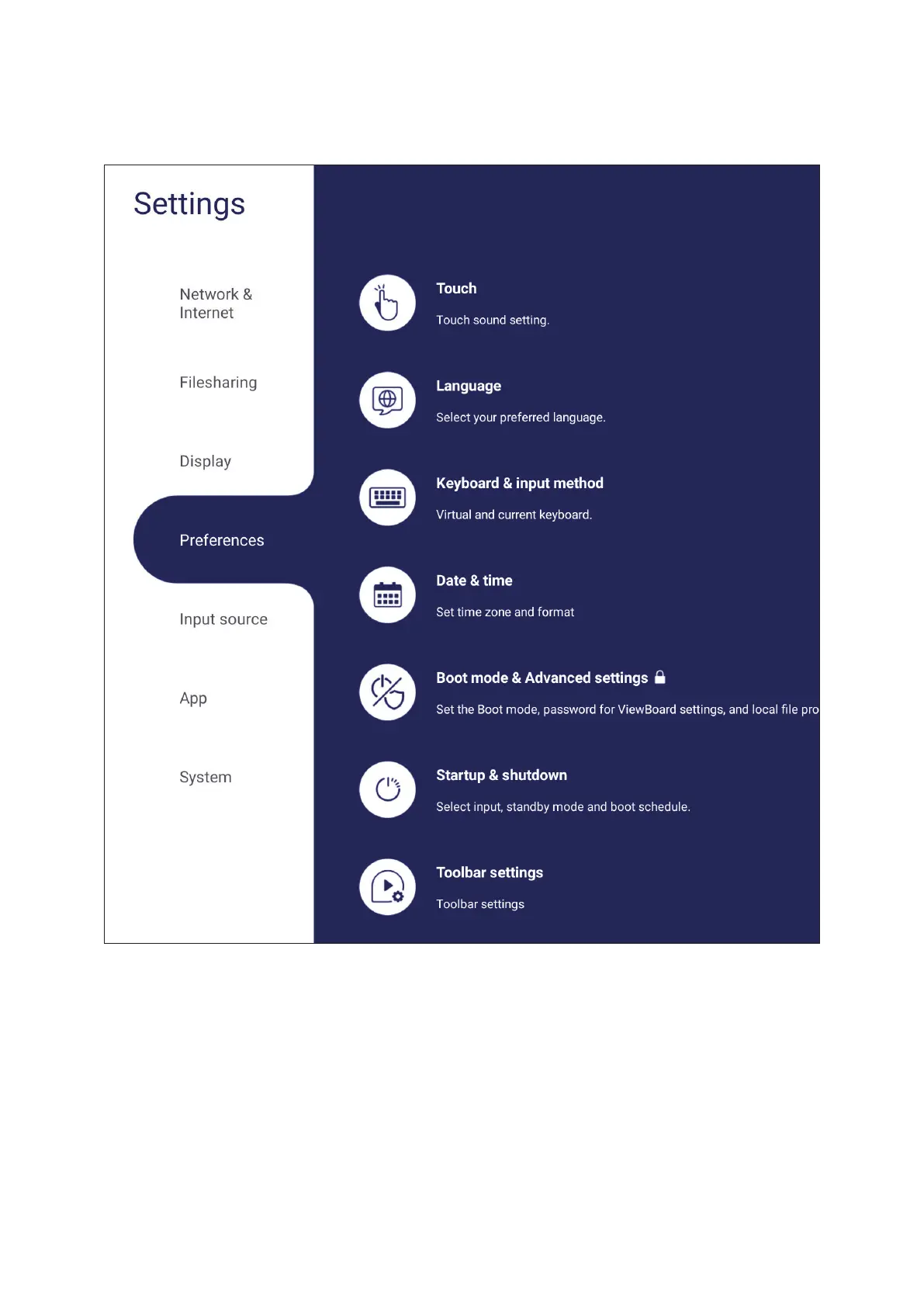 View and adjust Touch, Language, Keyboard & Input, Date & Time, Boot Mode &